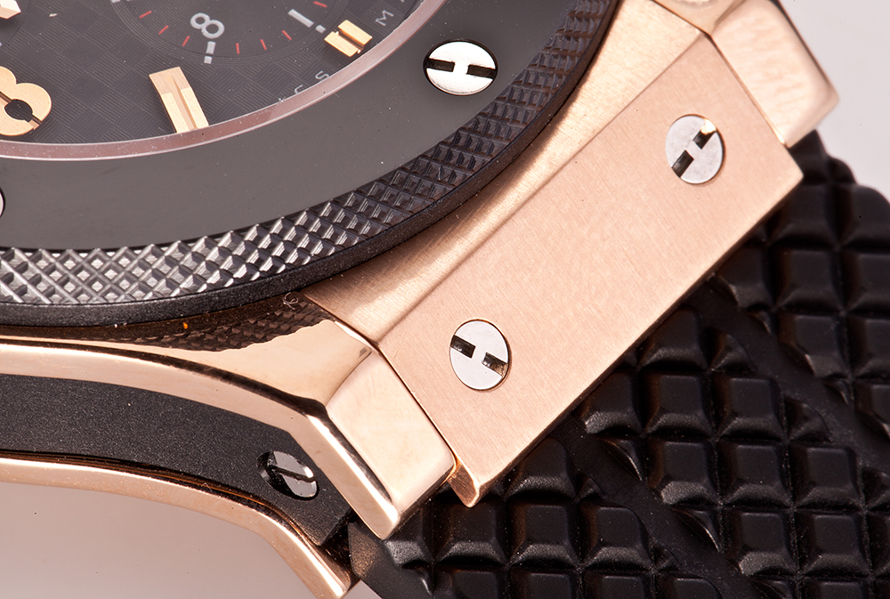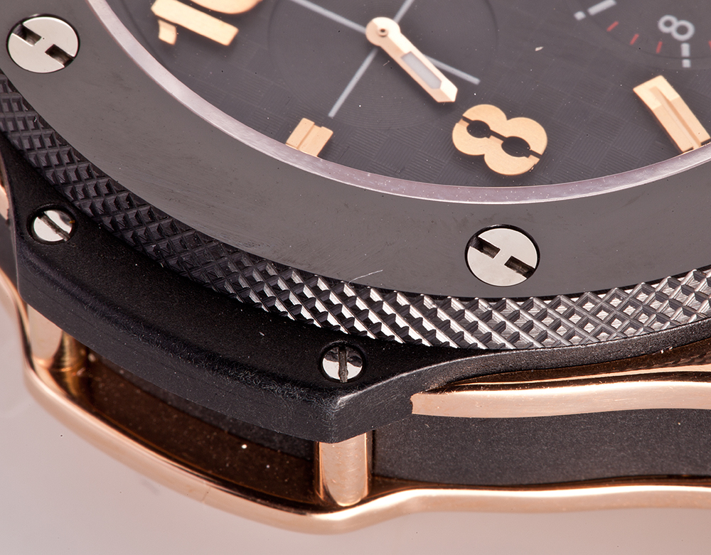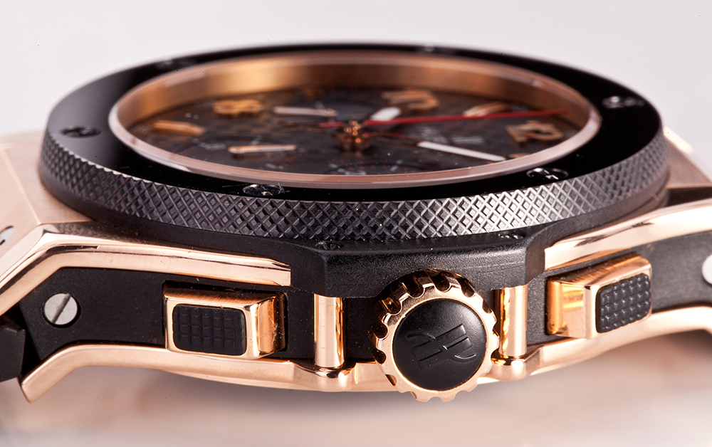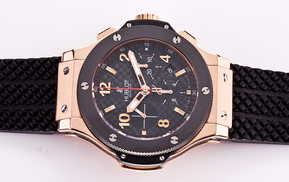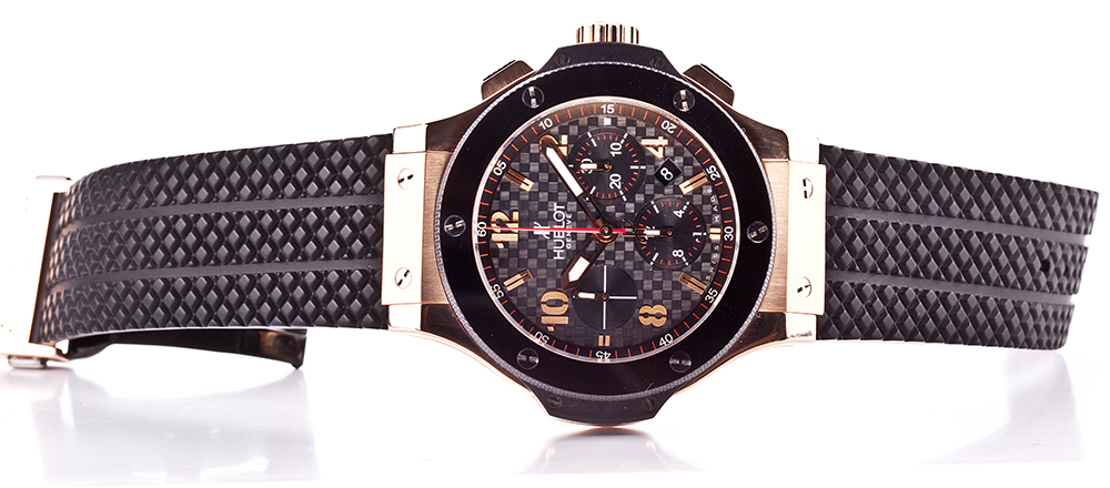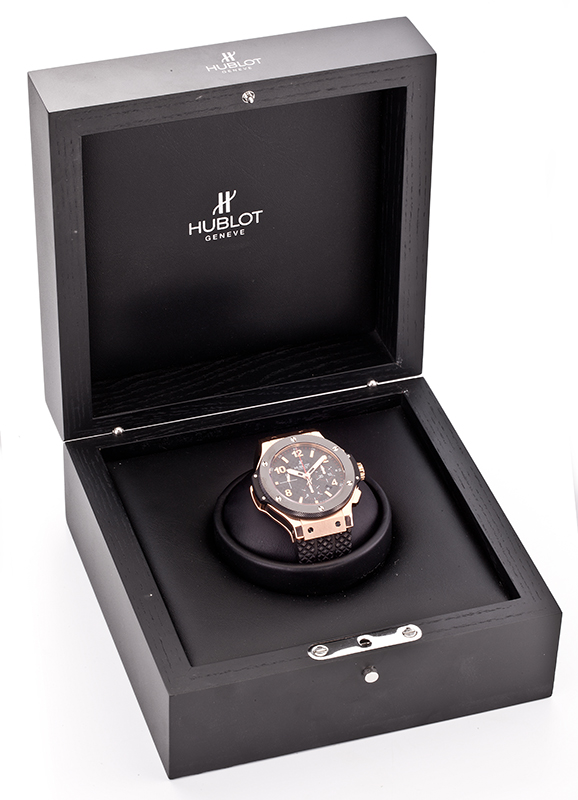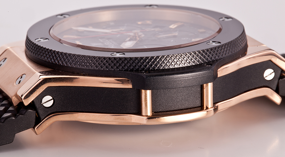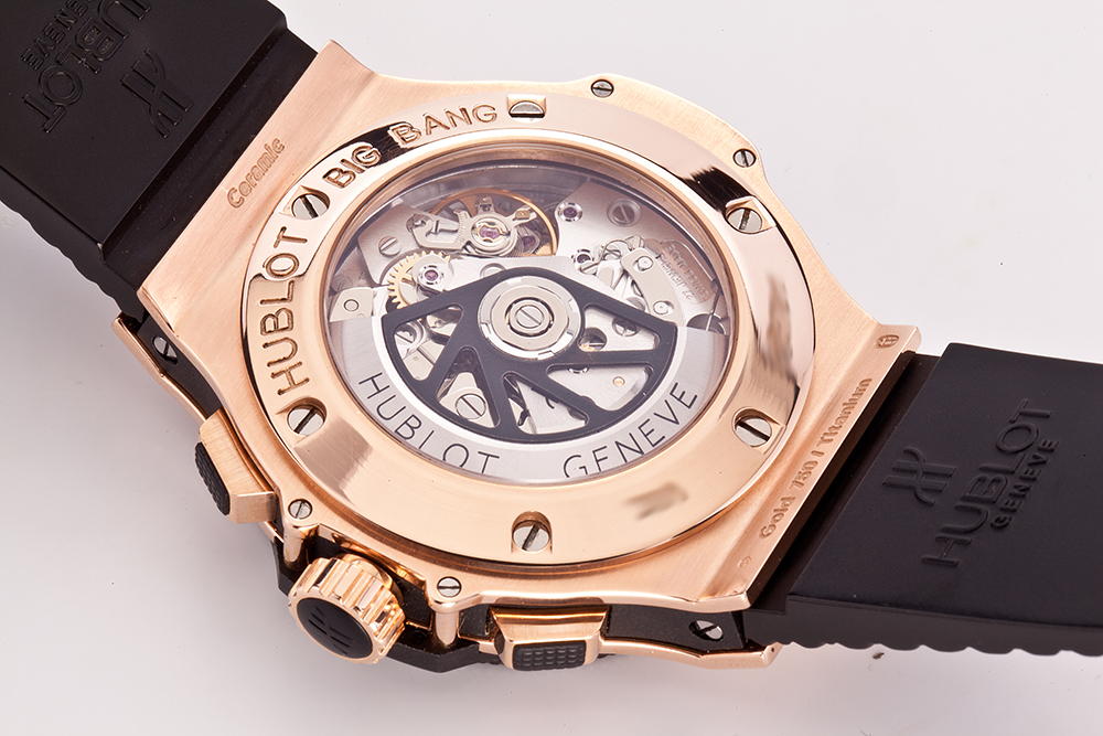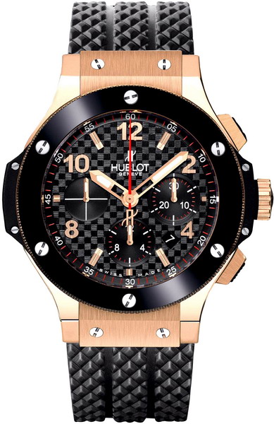 Модель Hublot Big Bang Gold Ceramic 301.PB.131.RX укомплектована автоматическим механизмом, Калибр HUB 44, с запасом хода 42 часа. На черном карбоновом циферблате отображаются функции часов, минут, секунд и даты. Часы с функцией хронографа выпущены в корпусе диаметром 44 мм из розового золота 18к и керамики на черном каучуковом ремешке с вставкой из розового золота 18к. Водонепроницаемость 100 м.