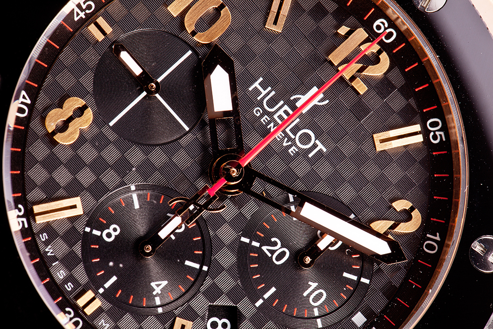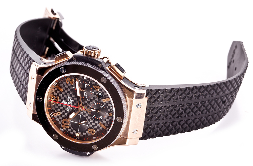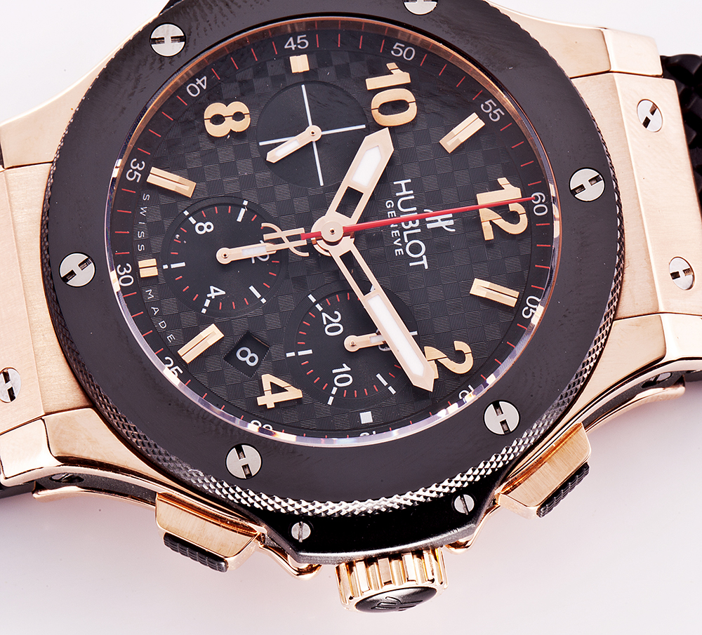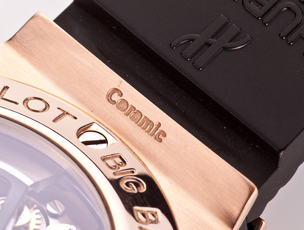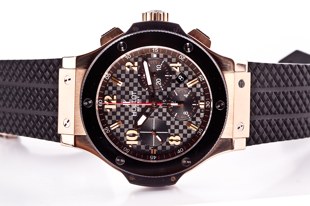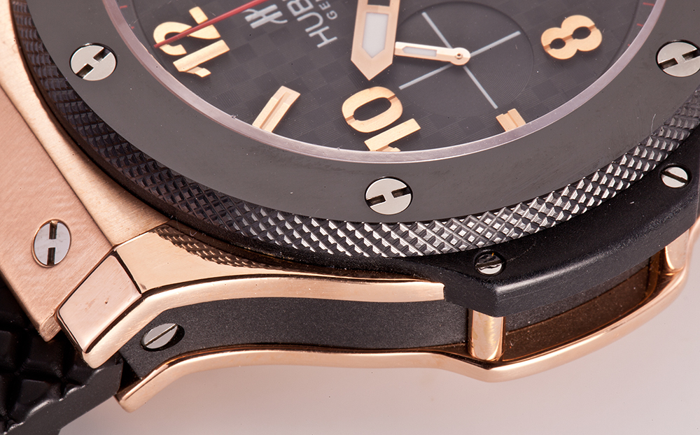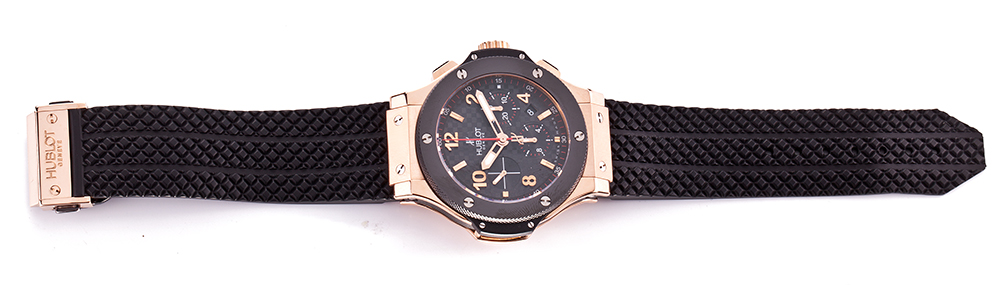 Модель Hublot Big Bang Gold Ceramic 301.PB.131.RX укомплектована автоматическим механизмом, Калибр HUB 44, с запасом хода 42 часа. На черном карбоновом циферблате отображаются функции часов, минут, секунд и даты. Часы с функцией хронографа выпущены в корпусе диаметром 44 мм из розового золота 18к и керамики на черном каучуковом ремешке с вставкой из розового золота 18к. Водонепроницаемость 100 м.