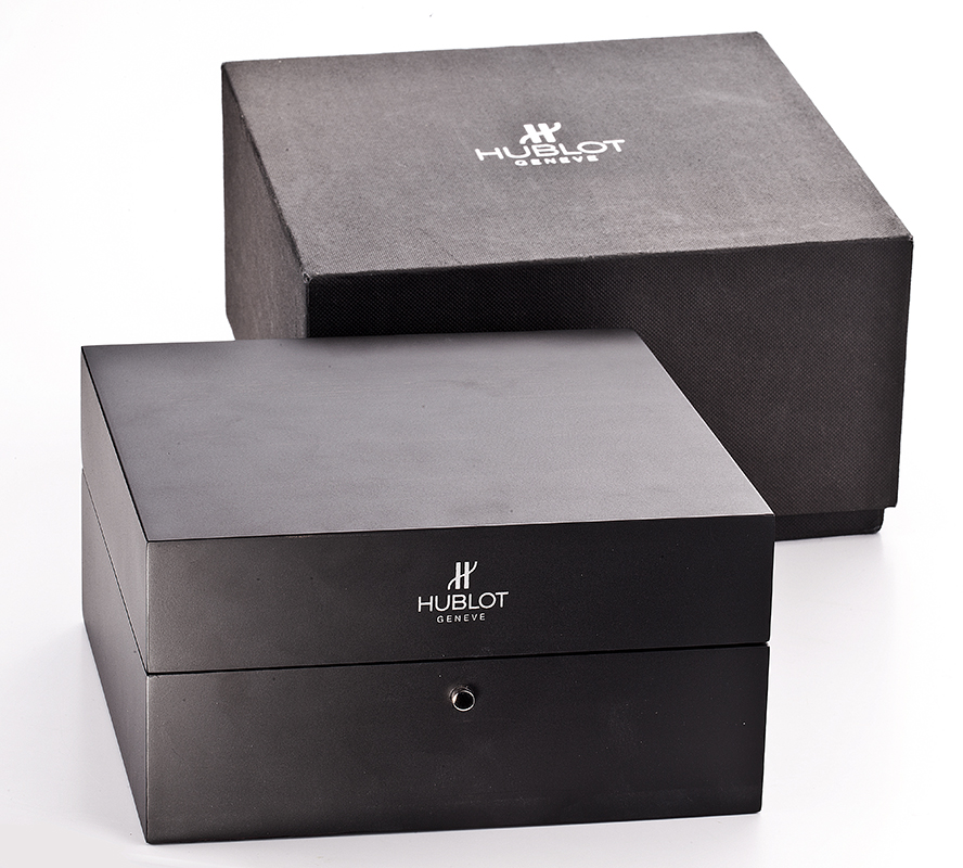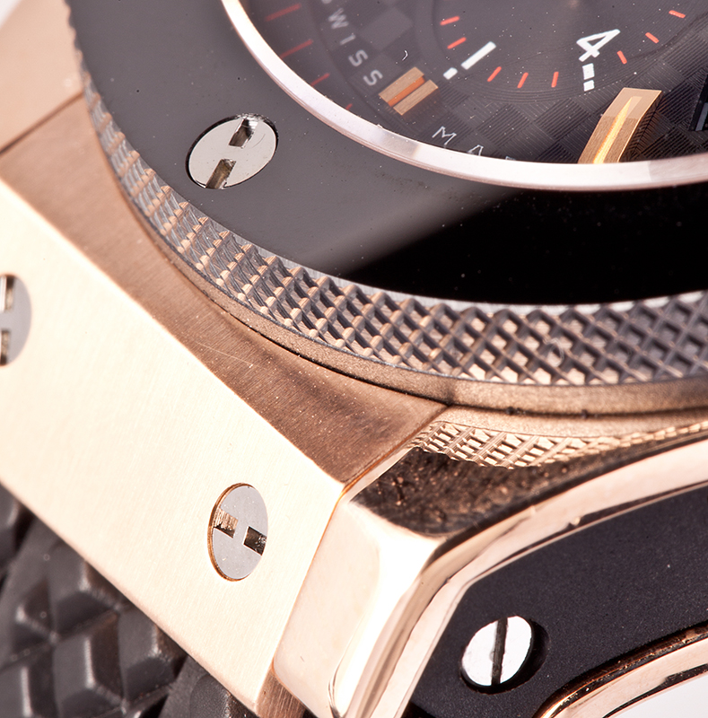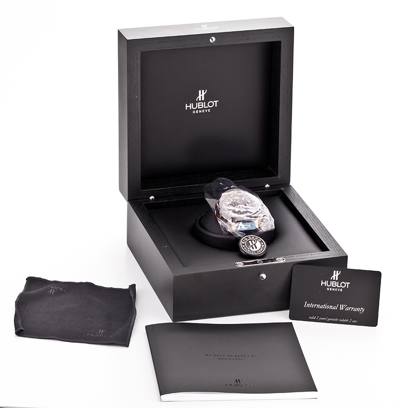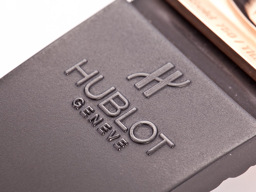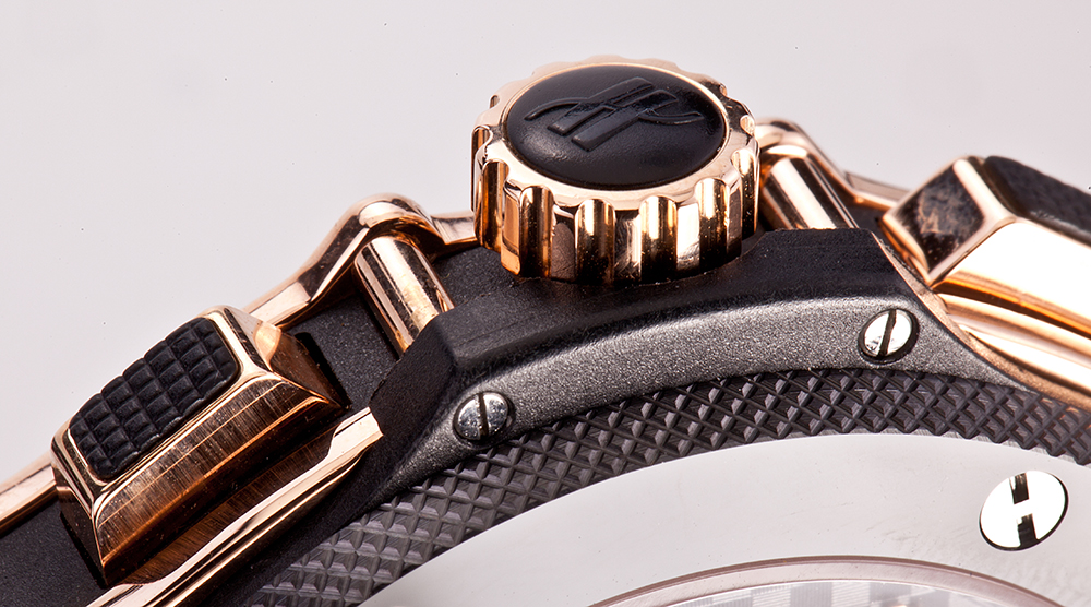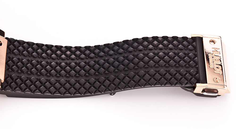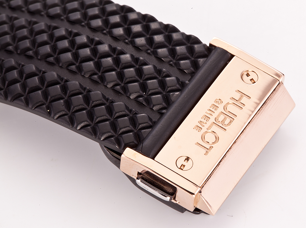 Модель Hublot Big Bang Gold Ceramic 301.PB.131.RX укомплектована автоматическим механизмом, Калибр HUB 44, с запасом хода 42 часа. На черном карбоновом циферблате отображаются функции часов, минут, секунд и даты. Часы с функцией хронографа выпущены в корпусе диаметром 44 мм из розового золота 18к и керамики на черном каучуковом ремешке с вставкой из розового золота 18к. Водонепроницаемость 100 м.