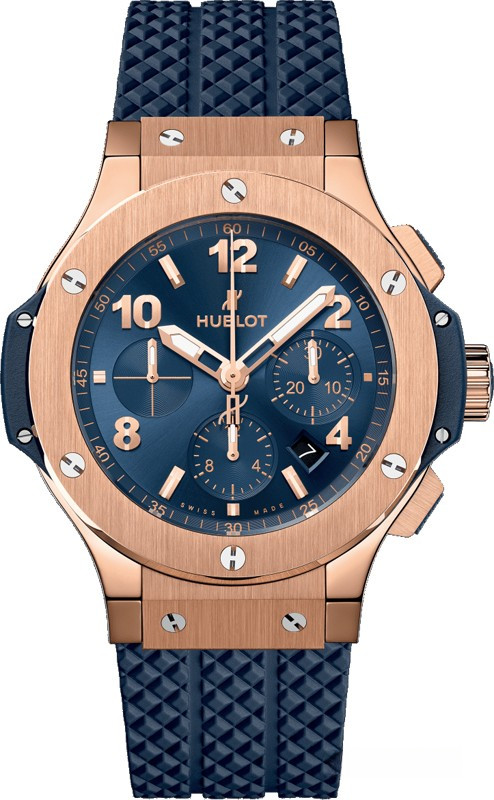 Модель Hublot Big Bang Chronograph 44 mm укомплектована автоматическим механизмом, Калибр HUB 4100 с запасом хода 42 часа. На синем циферблате отображаются функции часов, минут, секунд и даты. Часы с функцией хронографа выпущены в корпусе диаметром 44 мм из розового золота 18к на каучуковом ремешке с золотой застежкой. Водонепроницаемость 100 м.