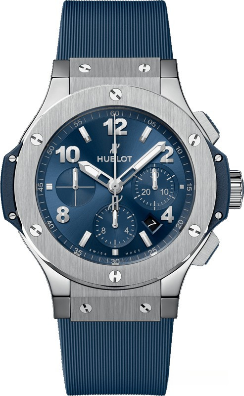 Модель Hublot Big Bang Chronograph 44 mm укомплектована автоматическим механизмом, Калибр HUB 4100 с запасом хода 42 часа. На синем циферблате отображаются функции часов, минут, секунд и даты. Часы с функцией хронографа выпущены в корпусе диаметром 44 мм из нержавеющей стали на каучуковом ремешке с застежкой из нержавеющей стали. Водонепроницаемость 100 м.