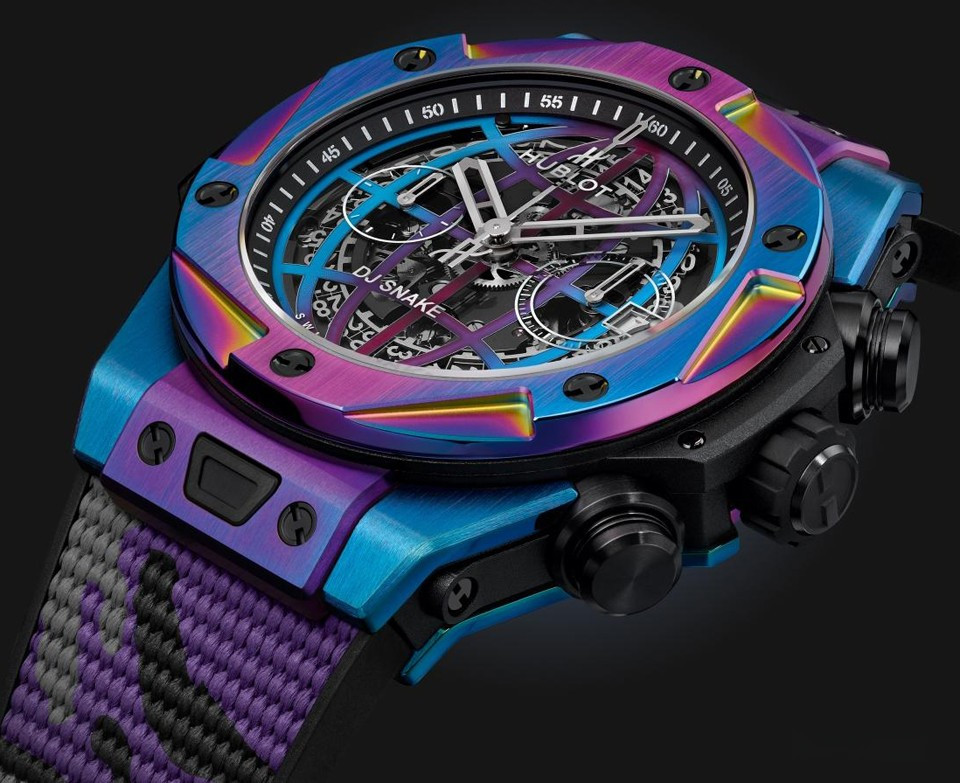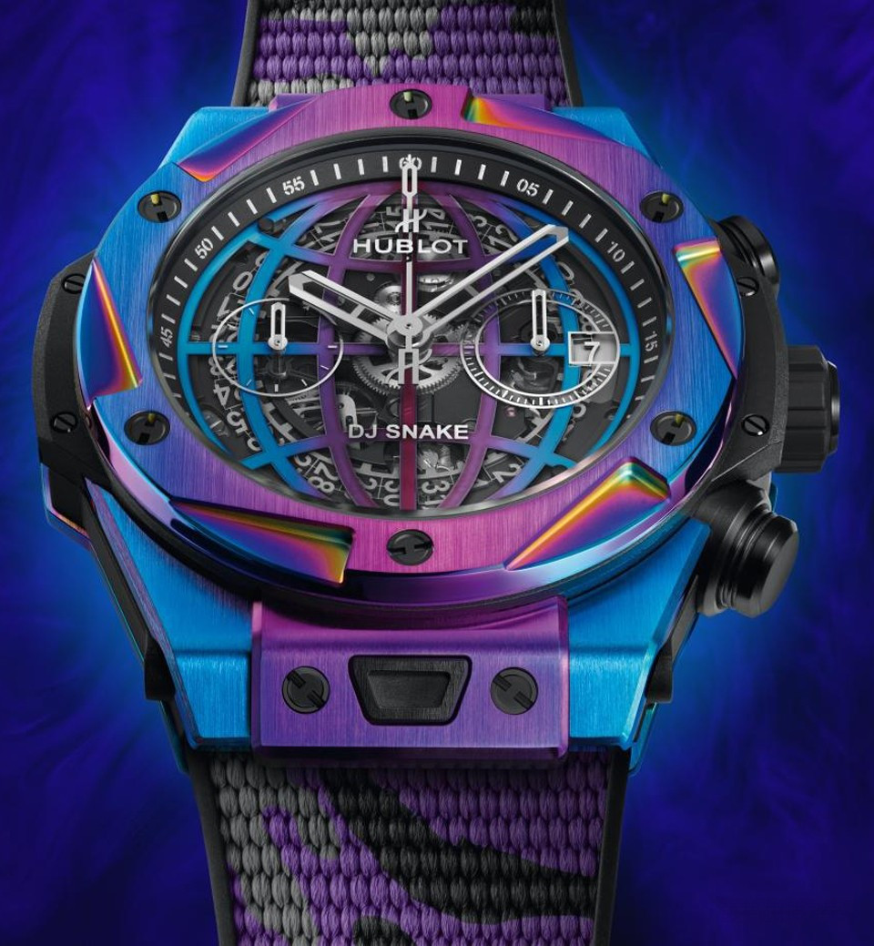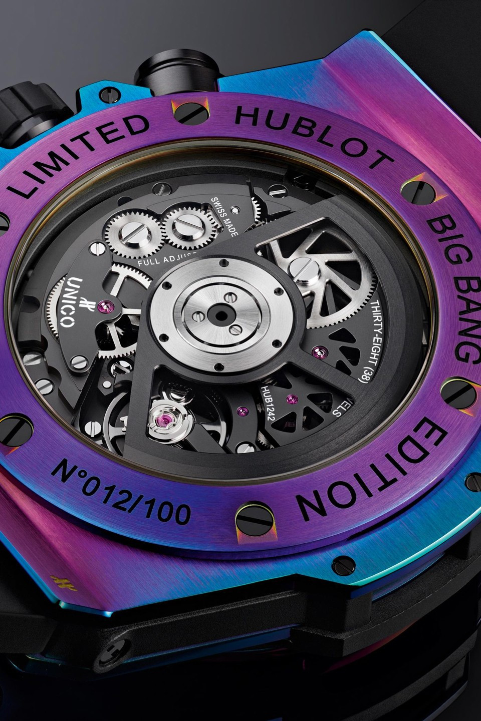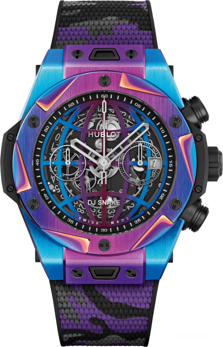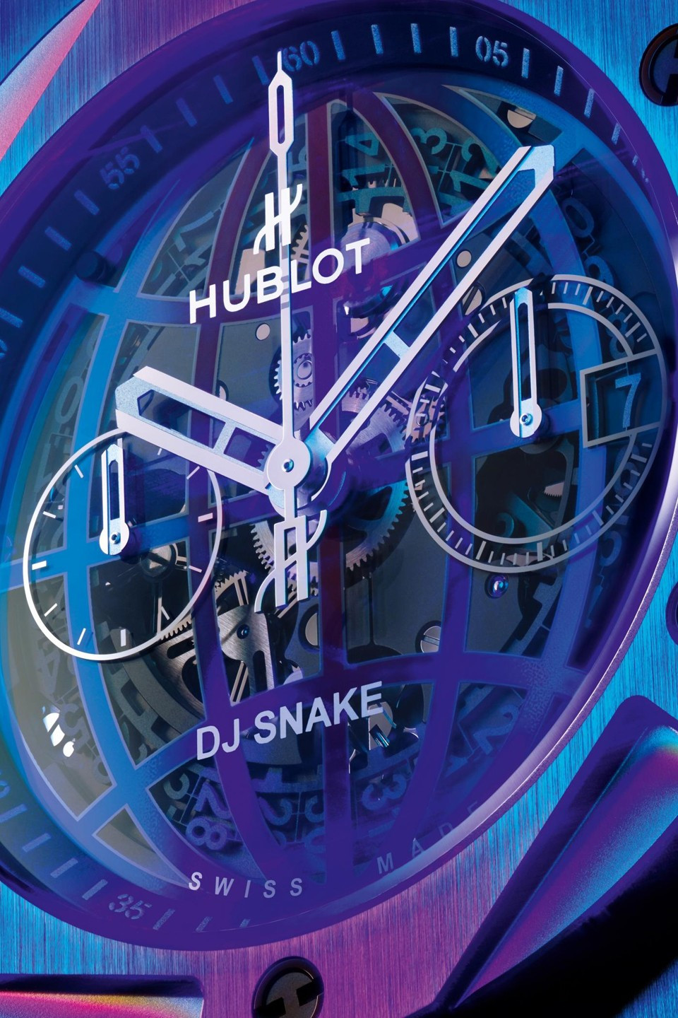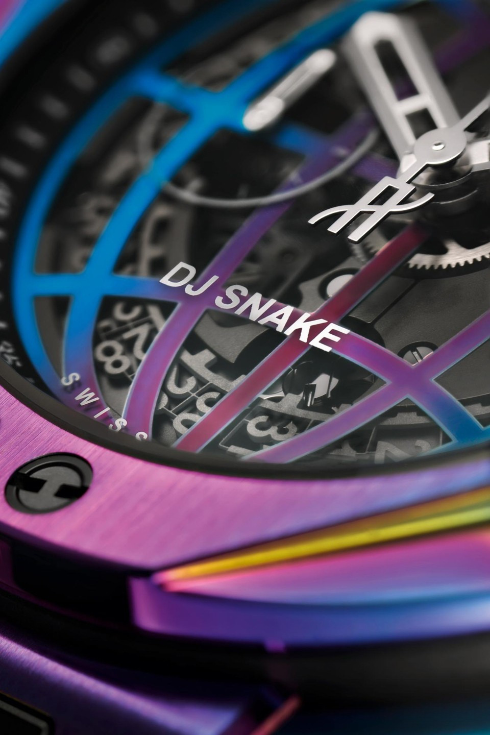 45-миллиметровые сатинированные, частично скелетонированные часы украшены тем, что Hublot описывает как эффект «колец Ньютона», при котором диапазон оттенков на часах точно ориентирован для достижения высокого уровня переливов, который меняется в зависимости от света и угла наклона. Лимитированная серия из 100 экземпляров Big Bang DJ Snake по цене 26 200 долларов будет поставляться с двумя легко заменяемыми ремешками: один из каучука с черным, пурпурным и серым камуфляжным рисунком, а другой из черного каучука. Часы с автоматическим механизмом и хронографом с обратным ходом Калибр HUB1242 UNICO имеют запас хода 72 часа.
