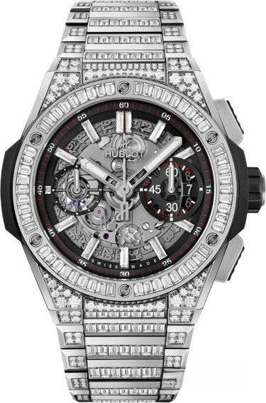 Часы Hublot Big Bang Integral 42 mm представлены в корпусе из титана диаметром 42 мм водонепроницаемостью 100 метров. Внутри корпуса установлен автоматический механизм с функцией хронографа, Калибр HUB1280, обладающий запасом хода 72 часа. На серебристом скелетированном циферблате с белыми багетными бриллиантами отображаются часы, минуты, секунды, дата. Часы поставляются на титановом браслете. Корпус инкрустирован белыми бриллиантами.