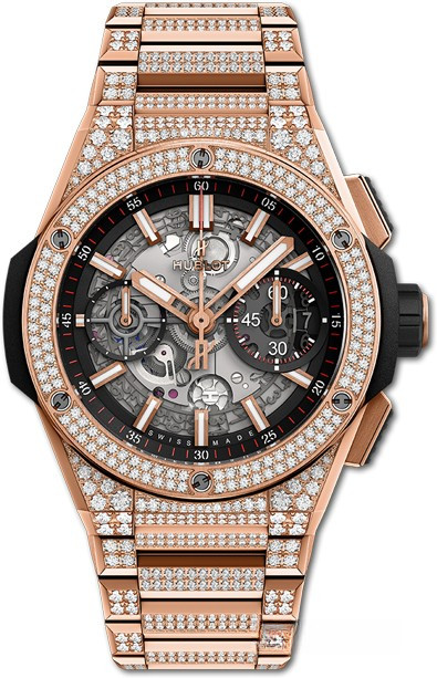 Часы Hublot Big Bang Integral 42 mm представлены в корпусе из розового золота 18к диаметром 42 мм водонепроницаемостью 100 метров. Внутри корпуса установлен автоматический механизм с функцией хронографа, Калибр HUB1280, обладающий запасом хода 72 часа. На серебристом скелетированном циферблате отображаются часы, минуты, секунды, дата. Часы поставляются на золотом браслете, инкрустированном белыми бриллиантами. Корпус инкрустирован белыми бриллиантами.