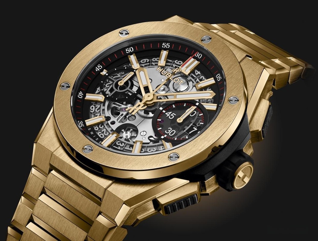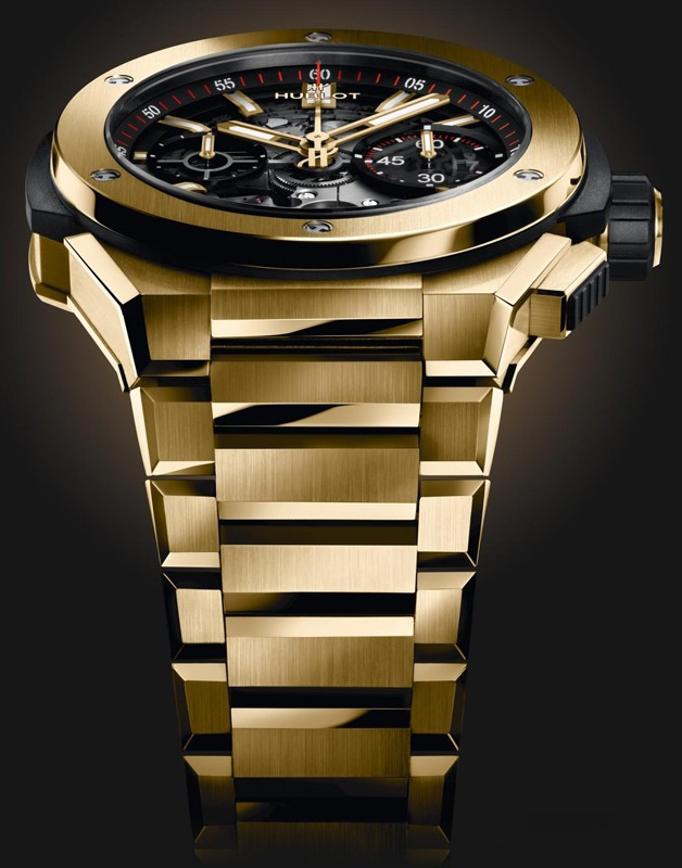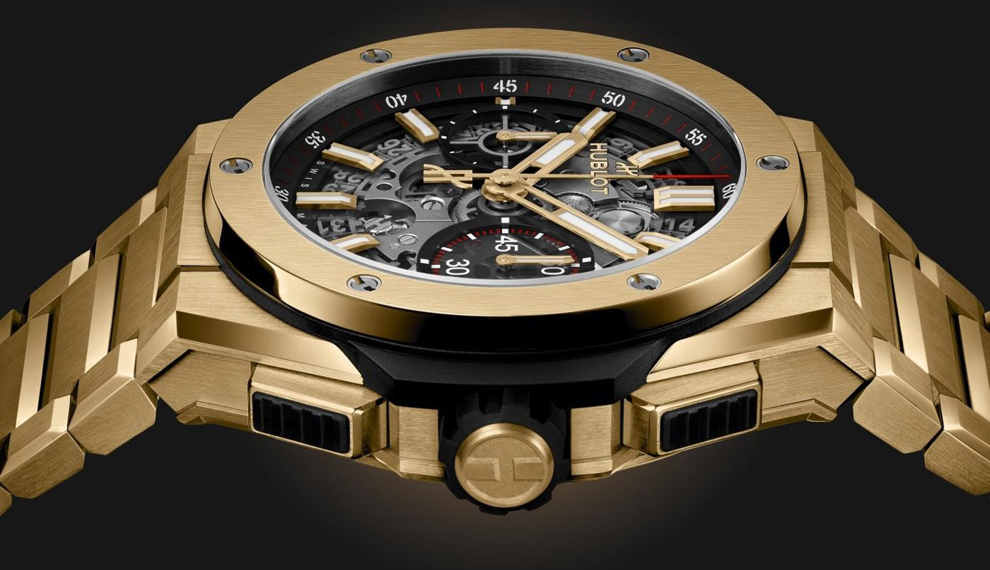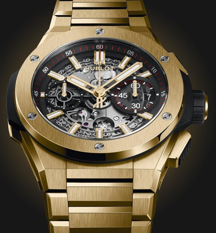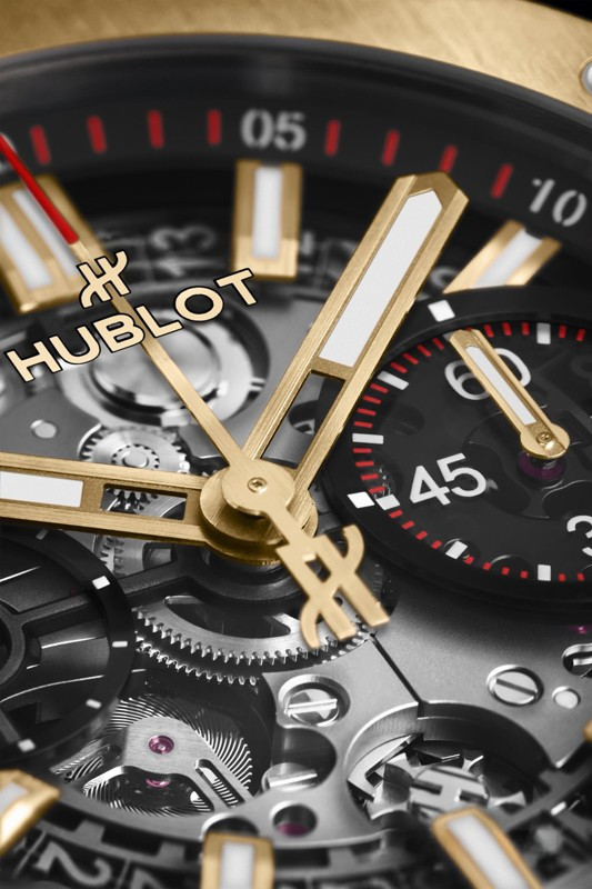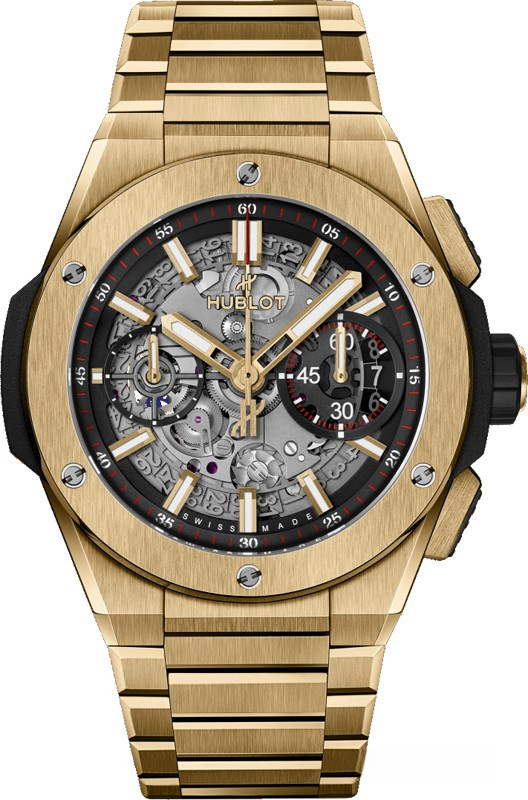 Часы Hublot Big Bang Integral 42 mm представлены в корпусе из желтого золота 18к диаметром 42 мм водонепроницаемостью 100 метров. Внутри корпуса установлен автоматический механизм с функцией хронографа, Калибр HUB1280, обладающий запасом хода 72 часа. На серебристом скелетированном циферблате отображаются часы, минуты, секунды, дата. Часы поставляются на золотом браслете.