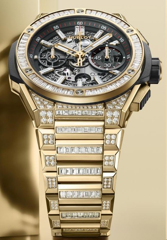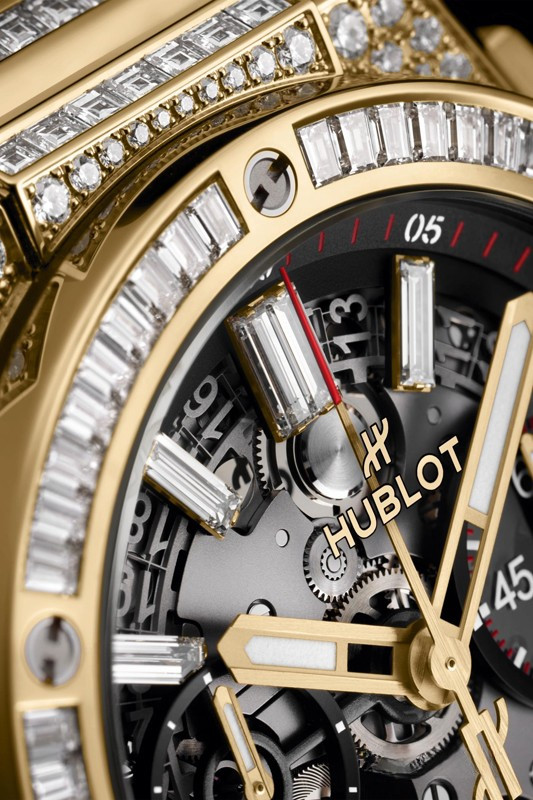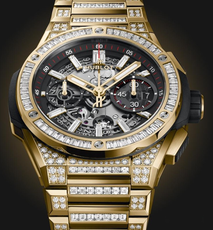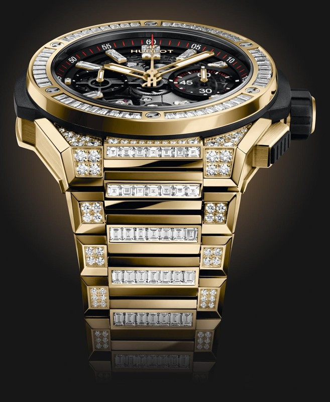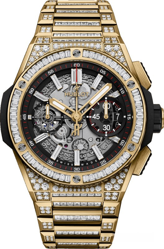 Часы Hublot Big Bang Integral 42 mm представлены в корпусе из желтого золота 18к диаметром 42 мм водонепроницаемостью 100 метров. Внутри корпуса установлен автоматический механизм с функцией хронографа, Калибр HUB1280, обладающий запасом хода 72 часа. На серебристом скелетированном циферблате отображаются часы, минуты, секунды, дата. Часы поставляются на золотом браслете, инкрустированном белыми бриллиантами. Корпус инкрустирован белыми бриллиантами.