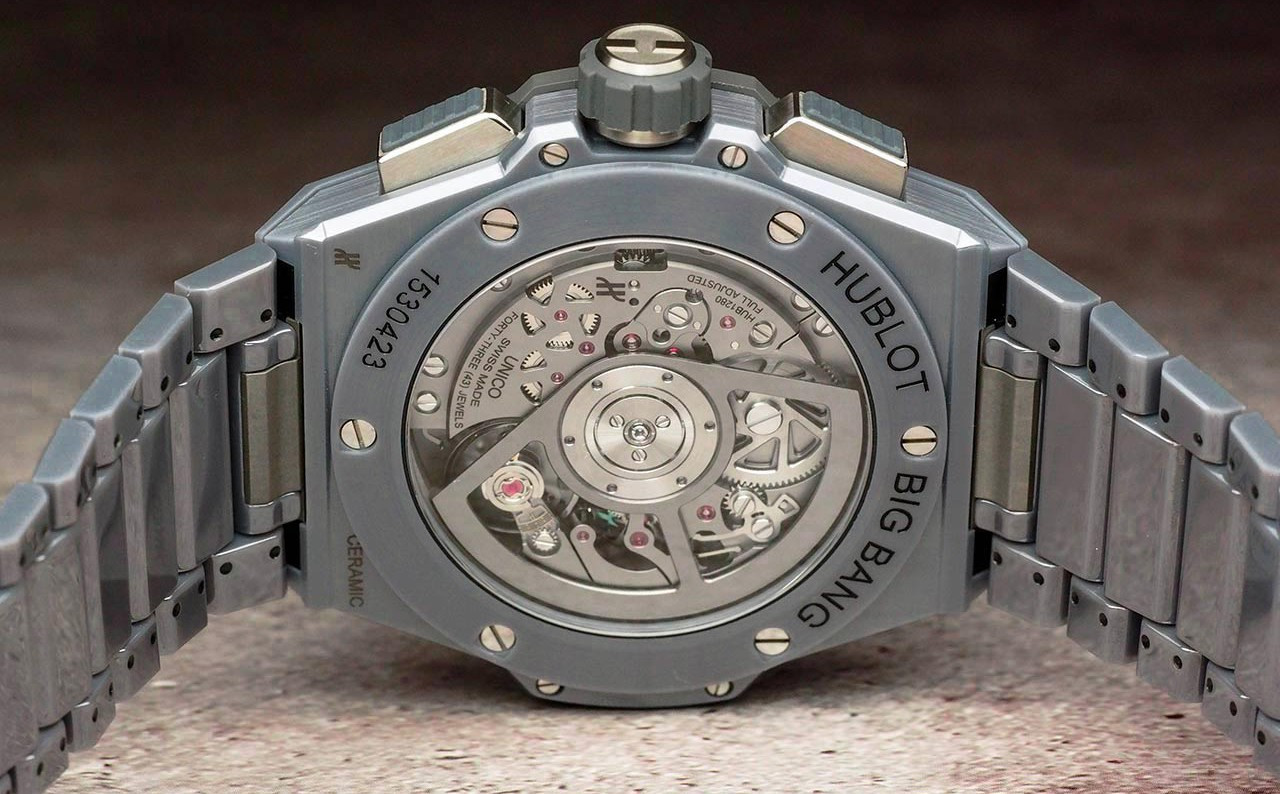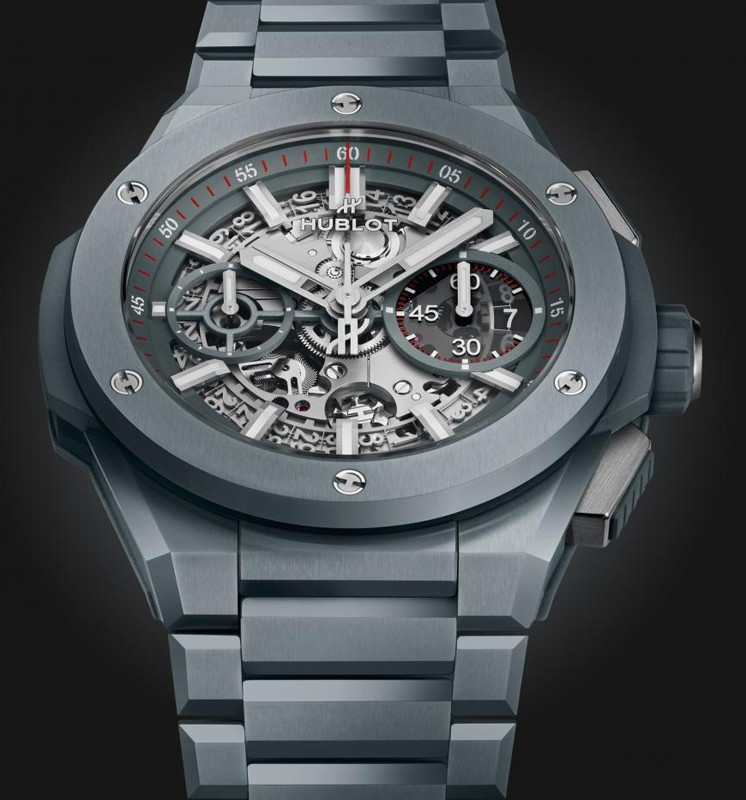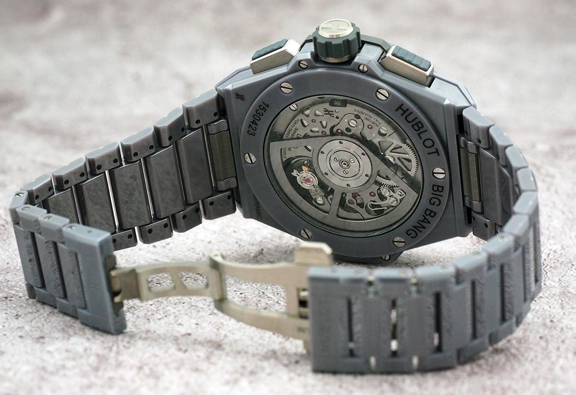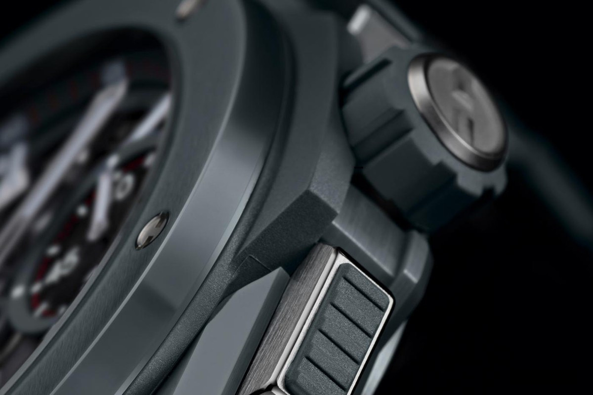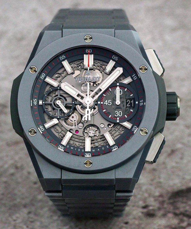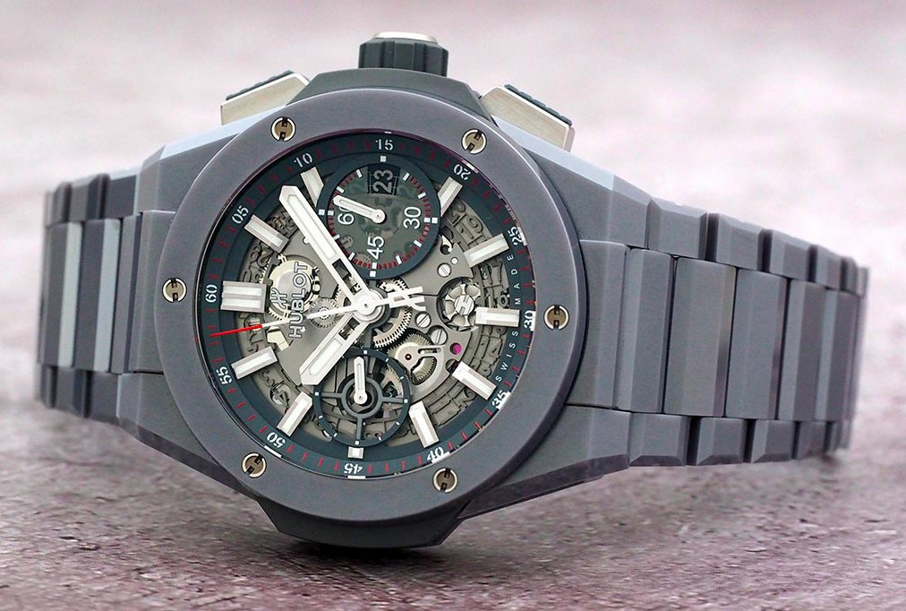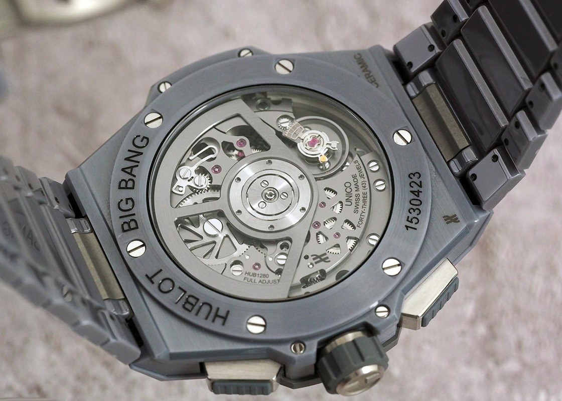 Часы Hublot Big Bang Integral 42 mm представлены в корпусе из керамики диаметром 42 мм водонепроницаемостью 100 метров. Внутри корпуса установлен автоматический механизм с функцией хронографа, Калибр HUB1280, обладающий запасом хода 72 часа. На серебристом скелетированном циферблате отображаются часы, минуты, секунды, дата. Часы поставляются на керамическом браслете.