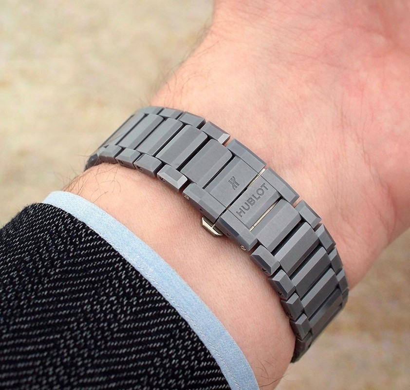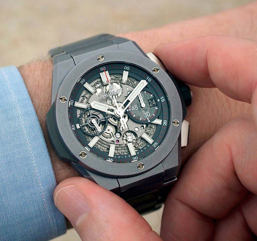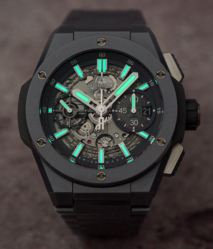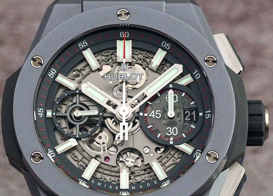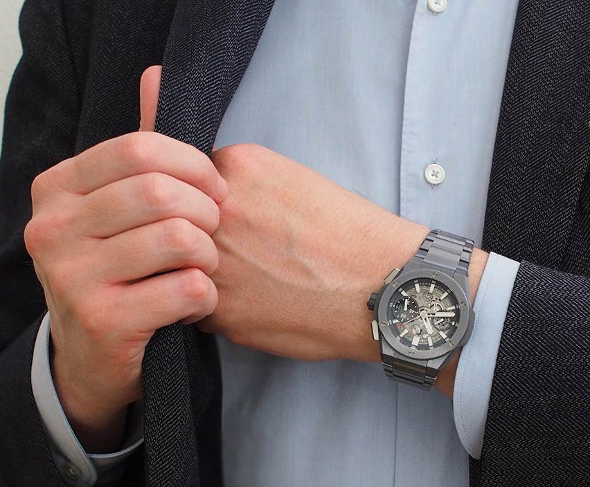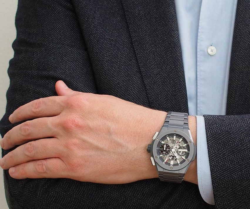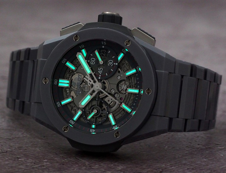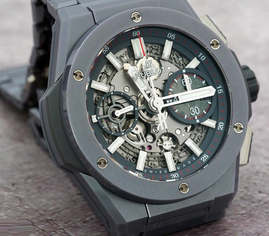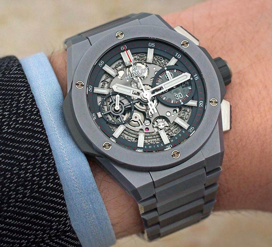 Часы Hublot Big Bang Integral 42 mm представлены в корпусе из керамики диаметром 42 мм водонепроницаемостью 100 метров. Внутри корпуса установлен автоматический механизм с функцией хронографа, Калибр HUB1280, обладающий запасом хода 72 часа. На серебристом скелетированном циферблате отображаются часы, минуты, секунды, дата. Часы поставляются на керамическом браслете.