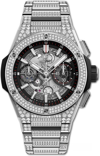 Часы Hublot Big Bang Integral 42 mm представлены в корпусе из титана диаметром 42 мм водонепроницаемостью 100 метров. Внутри корпуса установлен автоматический механизм с функцией хронографа, Калибр HUB1280, обладающий запасом хода 72 часа. На серебристом скелетированном циферблате отображаются часы, минуты, секунды, дата. Часы поставляются на титановом браслете, инкрустированном белыми бриллиантами. Корпус инкрустирован белыми бриллиантами.