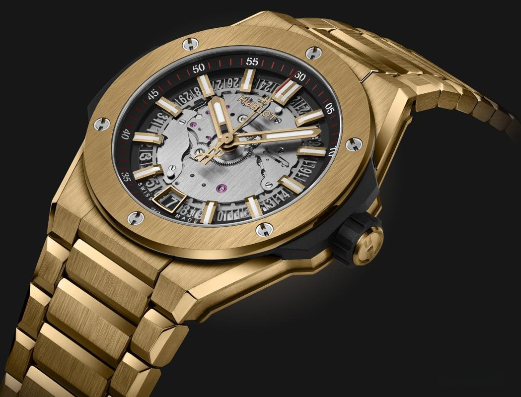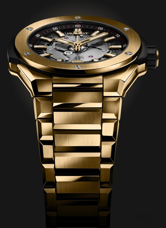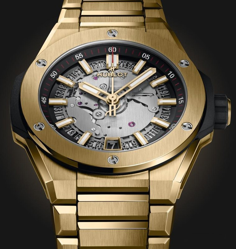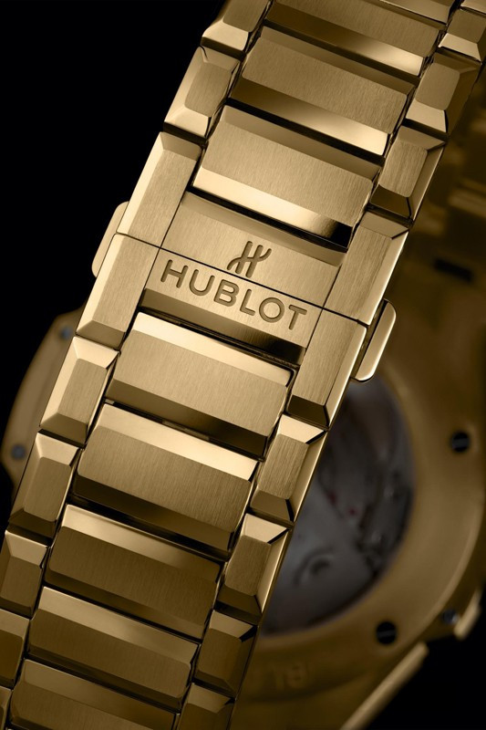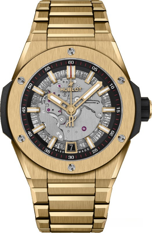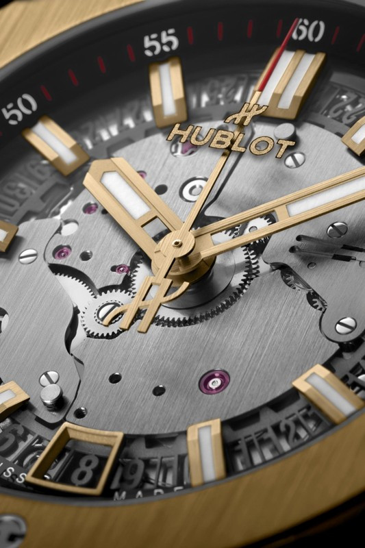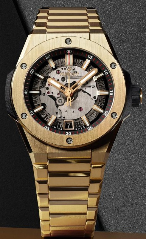 Часы Hublot Big Bang Integral Time Only представлены в корпусе из желтого золота 18к размером 40 мм водонепроницаемостью 100 м. Внутри корпуса установлен автоматический механизм, Калибр HUB1710, обладающий запасом хода 50 часов. На серебристом скелетированном циферблате отображаются часы, минуты, секунды, дата. Часы поставляются на золотом браслете.