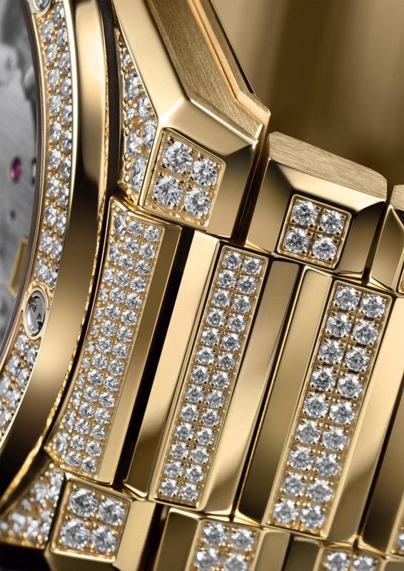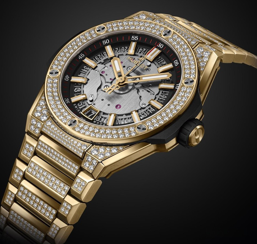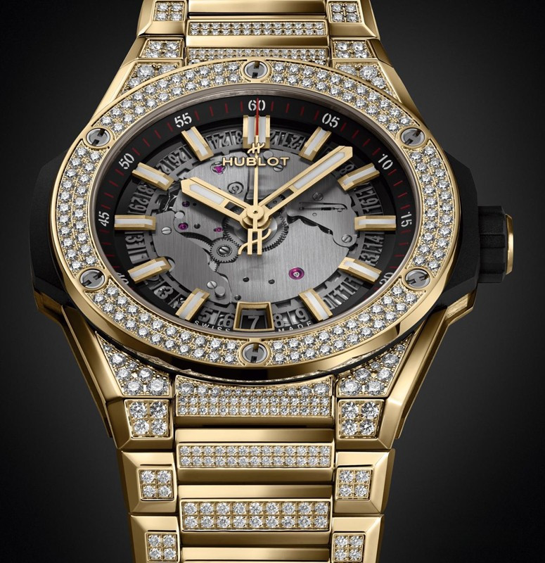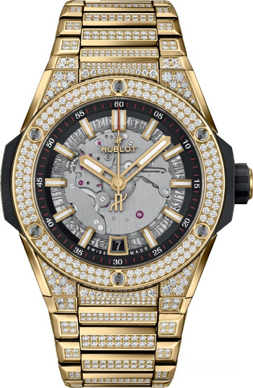 Часы Hublot Big Bang Integral Time Only представлены в корпусе из желтого золота 18к размером 40 х 9.25 мм водонепроницаемостью 100 м. Внутри корпуса установлен автоматический механизм, Калибр HUB1710, обладающий запасом хода 50 часов. На сером скелетированном циферблате отображаются часы, минуты, секунды, дата. Часы поставляются на золотом браслете, инкрустированном белыми бриллиантами. Корпус инкрустирован белыми бриллиантами.