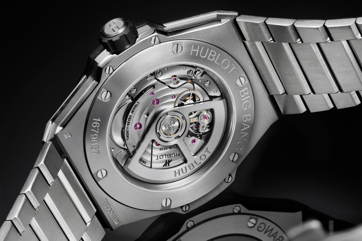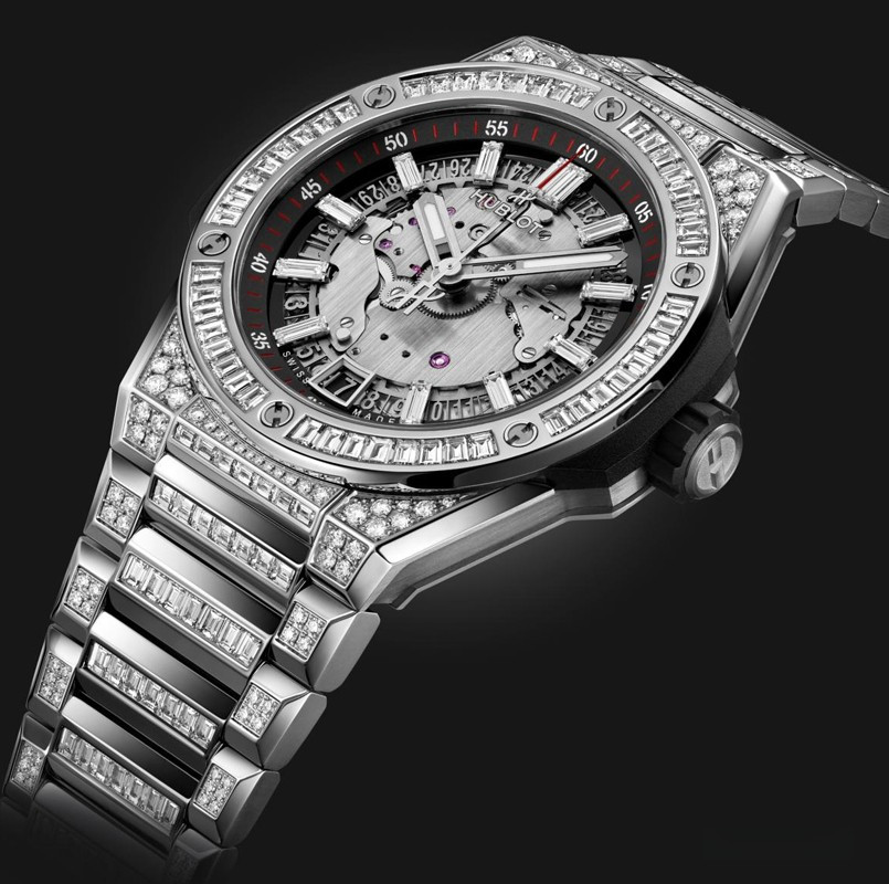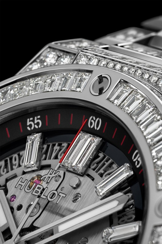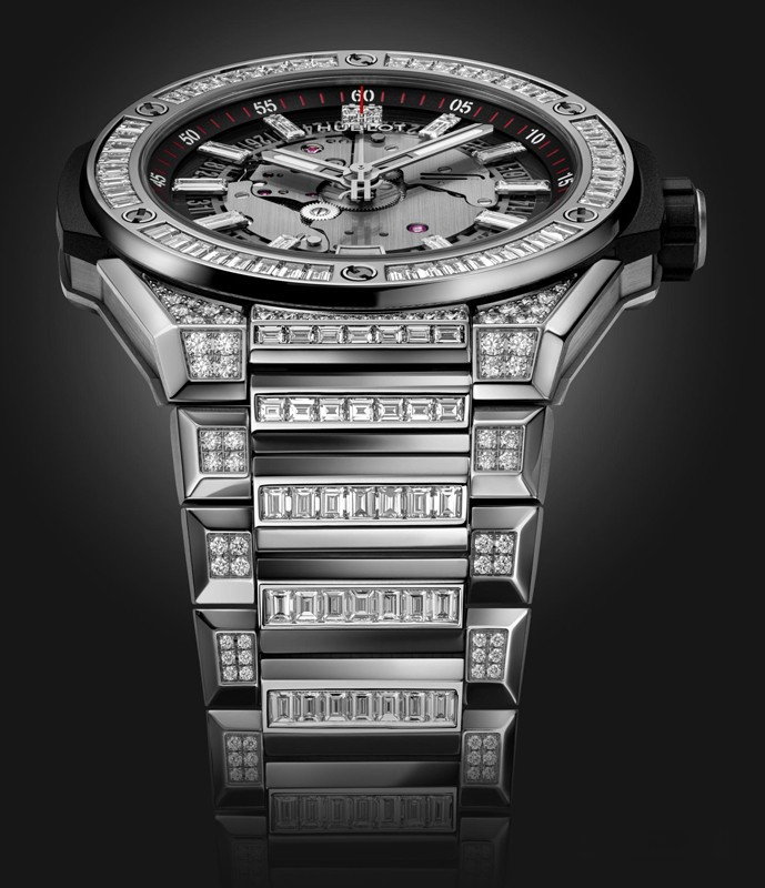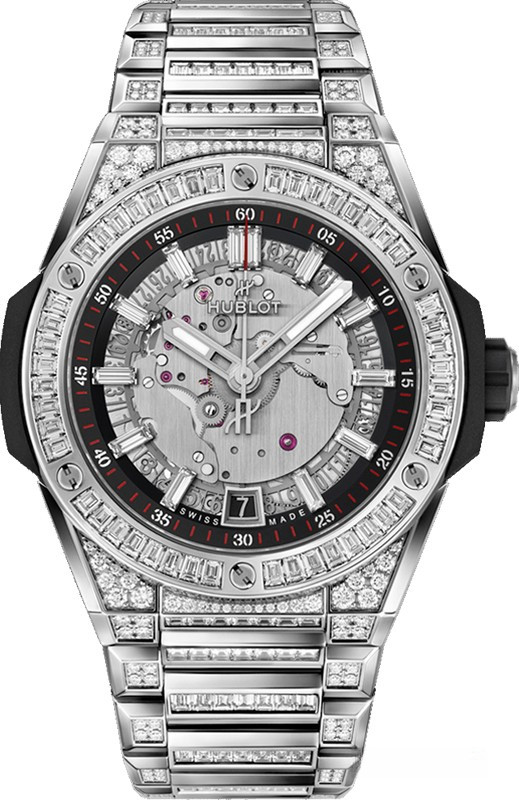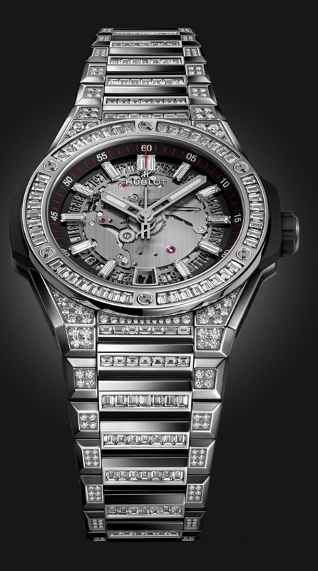 Часы Hublot Big Bang Integral Time Only представлены в корпусе из титана размером 40 х 9.25 мм водонепроницаемостью 100 м. Внутри корпуса установлен автоматический механизм, Калибр HUB1710, обладающий запасом хода 50 часов. На сером скелетированном циферблате отображаются часы, минуты, секунды, дата. Часы поставляются на титановом браслете, инкрустированном белыми бриллиантами. Корпус инкрустирован белыми бриллиантами.