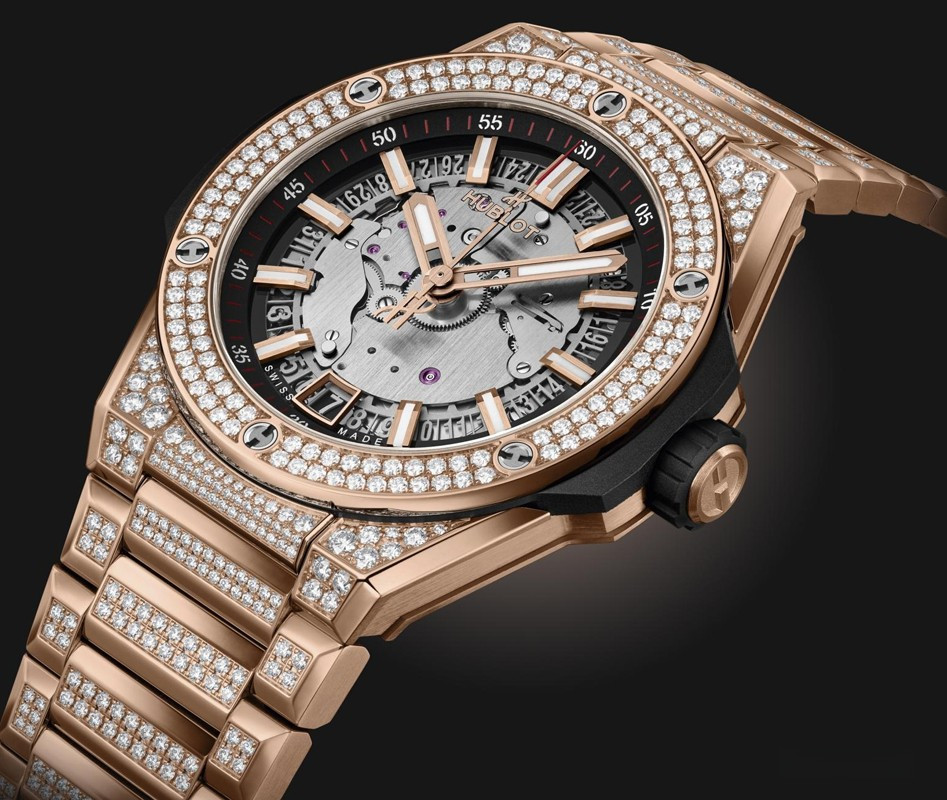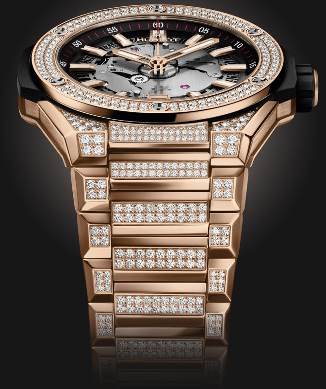 Часы Hublot Big Bang Integral Time Only представлены в корпусе из розового золота 18к размером 40 х 9.25 мм водонепроницаемостью 100 м. Внутри корпуса установлен автоматический механизм, Калибр HUB1710, обладающий запасом хода 50 часов. На сером скелетированном циферблате отображаются часы, минуты, секунды, дата. Часы поставляются на золотом браслете, инкрустированном белыми бриллиантами. Корпус инкрустирован белыми бриллиантами.