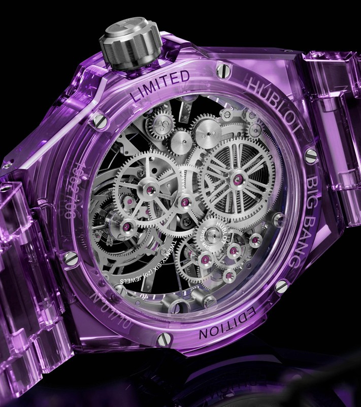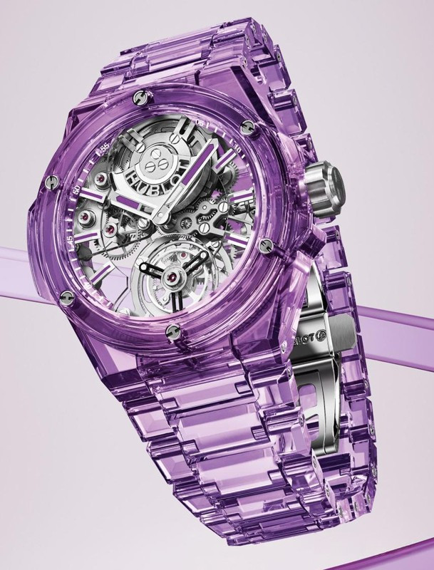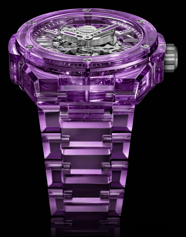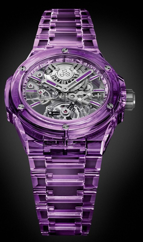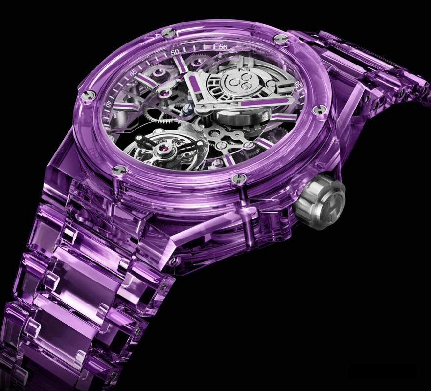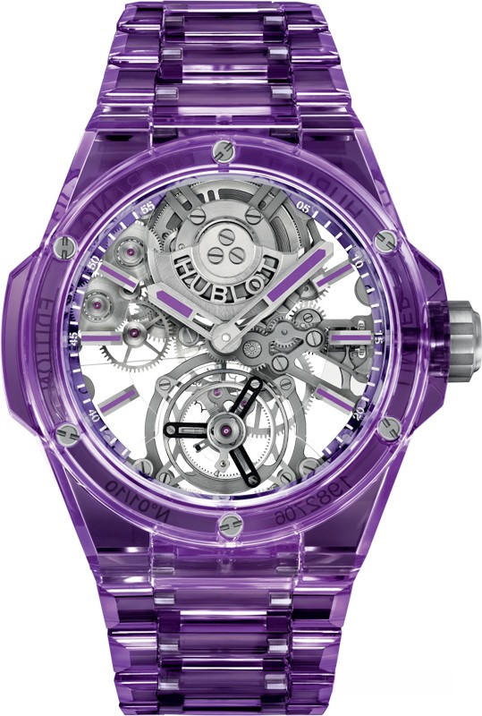 Часы Hublot Big Bang Integral Tourbillon Full 43 mm представлены в корпусе из сапфира размером 43 мм и водонепроницаемостью 30 м. Внутри корпуса установлен автоматический механизм, Калибр HUB6035, обладающий запасом хода 72 часа. На серебристом скелетированном циферблате отображаются часы, минуты, турбийон. Часы комплектуются браслетом из сапфира. Серия ограничена - 10 шт.