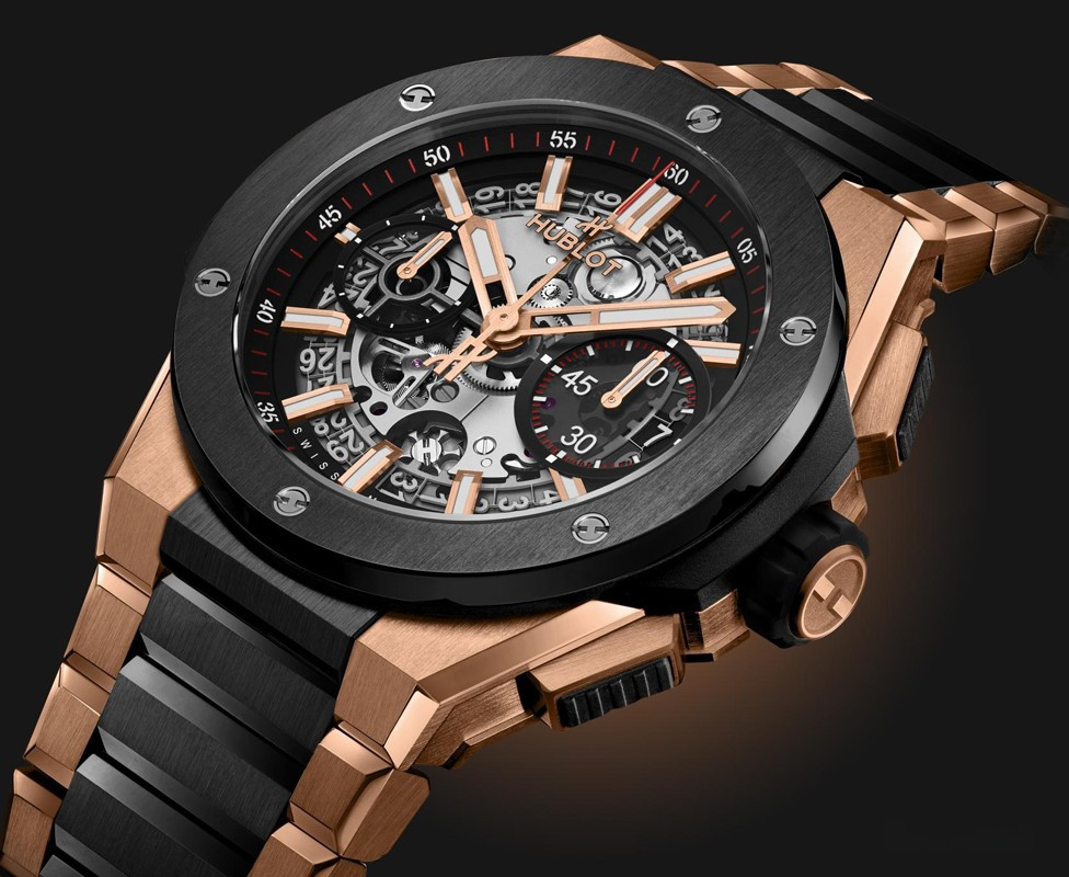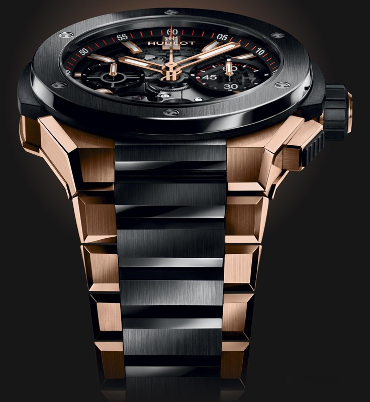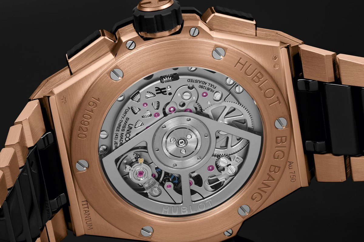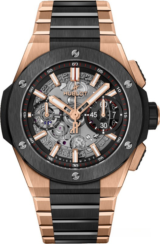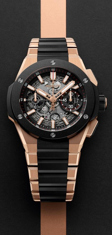 Часы Hublot Big Bang Integrated 42 mm представлены в корпусе из розового золота 18к и керамики размером 42 мм водонепроницаемостью 100 метров. Внутри корпуса установлен автоматический механизм, Калибр HUB1280 UNICO, обладающий запасом хода 72 часа. На сером циферблате отображаются часы, минуты, секунды, дата, накопители хронографа. Часы комплектуются золотым браслетом с керамической вставкой.