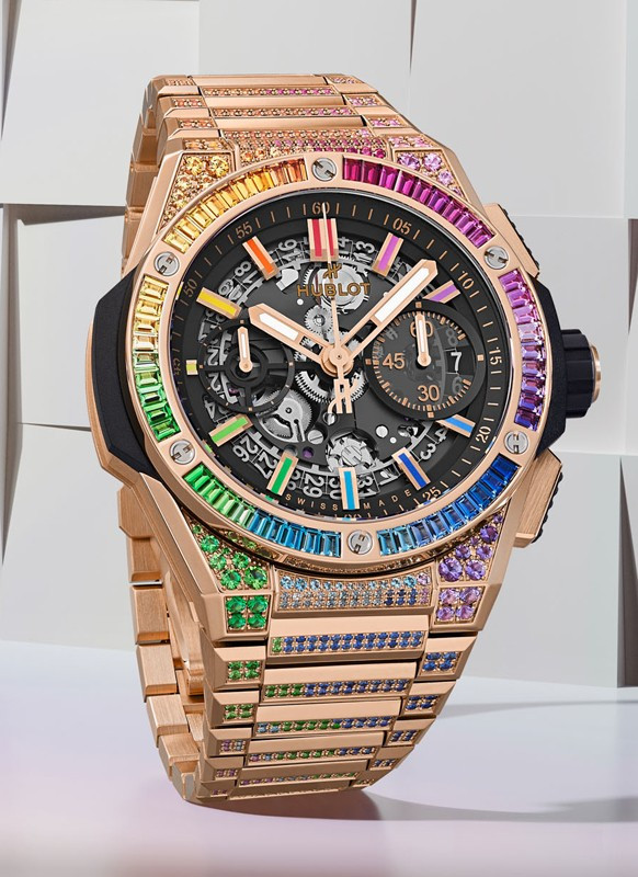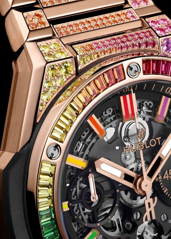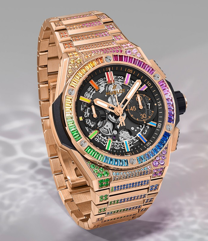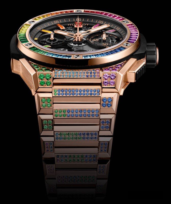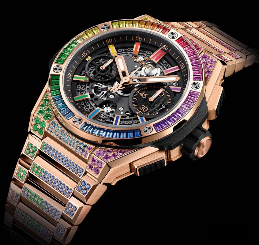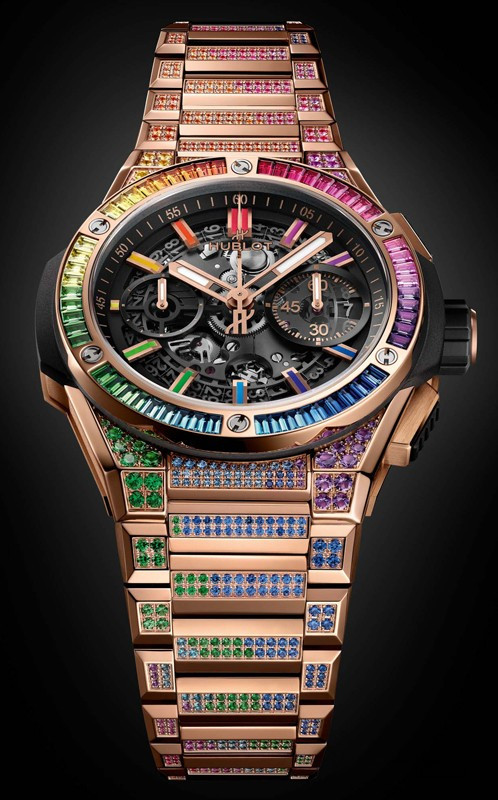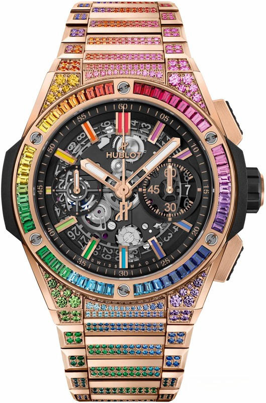 Часы Hublot Big Bang Integrated 42 mm представлены в корпусе из розового золота 18к размером 42 мм водонепроницаемостью 100 метров. Внутри корпуса установлен автоматический механизм, Калибр HUB1280 UNICO, обладающий запасом хода 72 часа. На сером циферблате отображаются часы, минуты, секунды, дата, накопители хронографа. Часы комплектуются золотым браслетом. Корпус и браслет инкрустированы разноцветными драгоценными камнями.