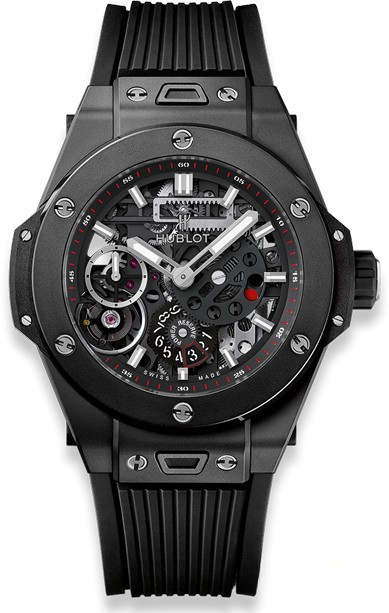 Выполненные в традиционном для Big Bang 45-мм корпусе (с водостойкостью до 100 м) MECA-10 представлены в керамическом корпусе. Модель получила новый скелетезированный часовой механизм HUB1201 с ручным подзаводом. Резерв хода HUB1201 — около 10 суток. Такой запас хода Big Bang MECA-10 обеспечивают две пружины, потому заводных барабанов у них тоже два и два индикатора запаса хода. На циферблате отображаются часы, минуты, секунды, запас хода. HUB1201 состоит из 223 отдельных деталей, и буквально каждую из них в действии можно рассмотреть через прозрачные переднее и заднее сапфировые стекла. Big Bang MECA-10 комплектуются каучуковым ремнем, который оснащен специальной системой быстрой замены «One Click».