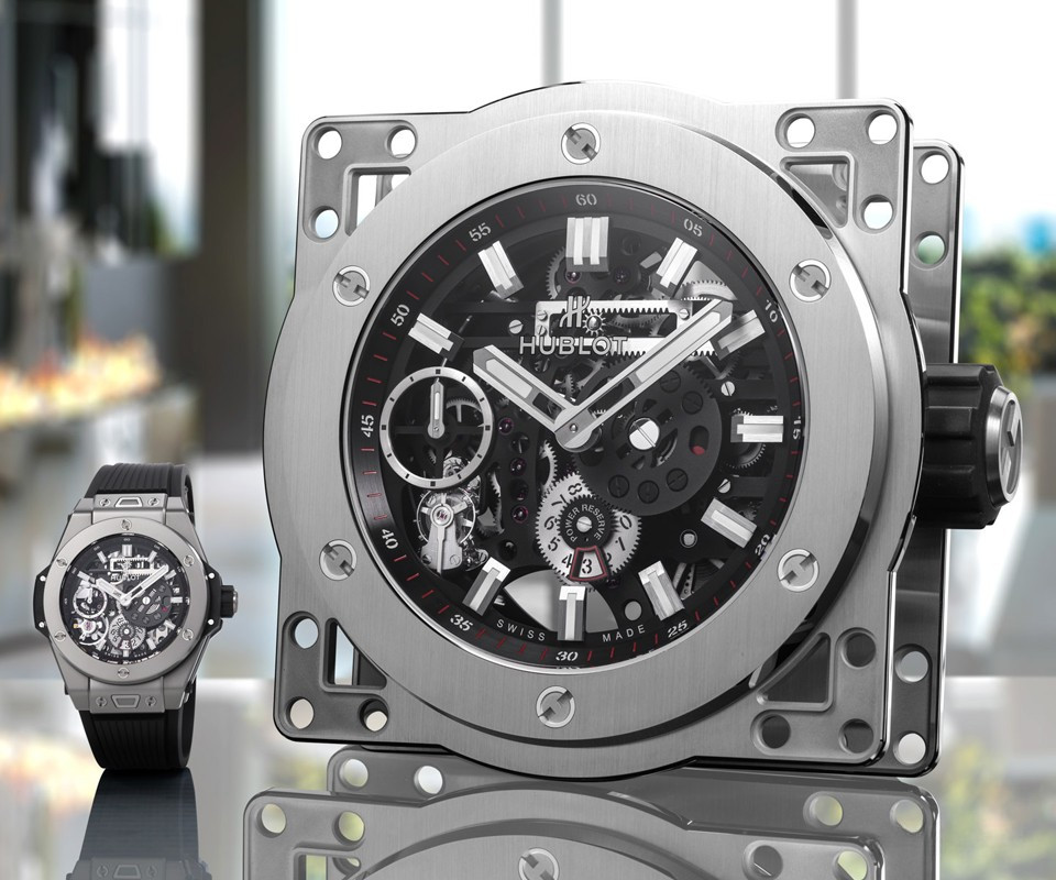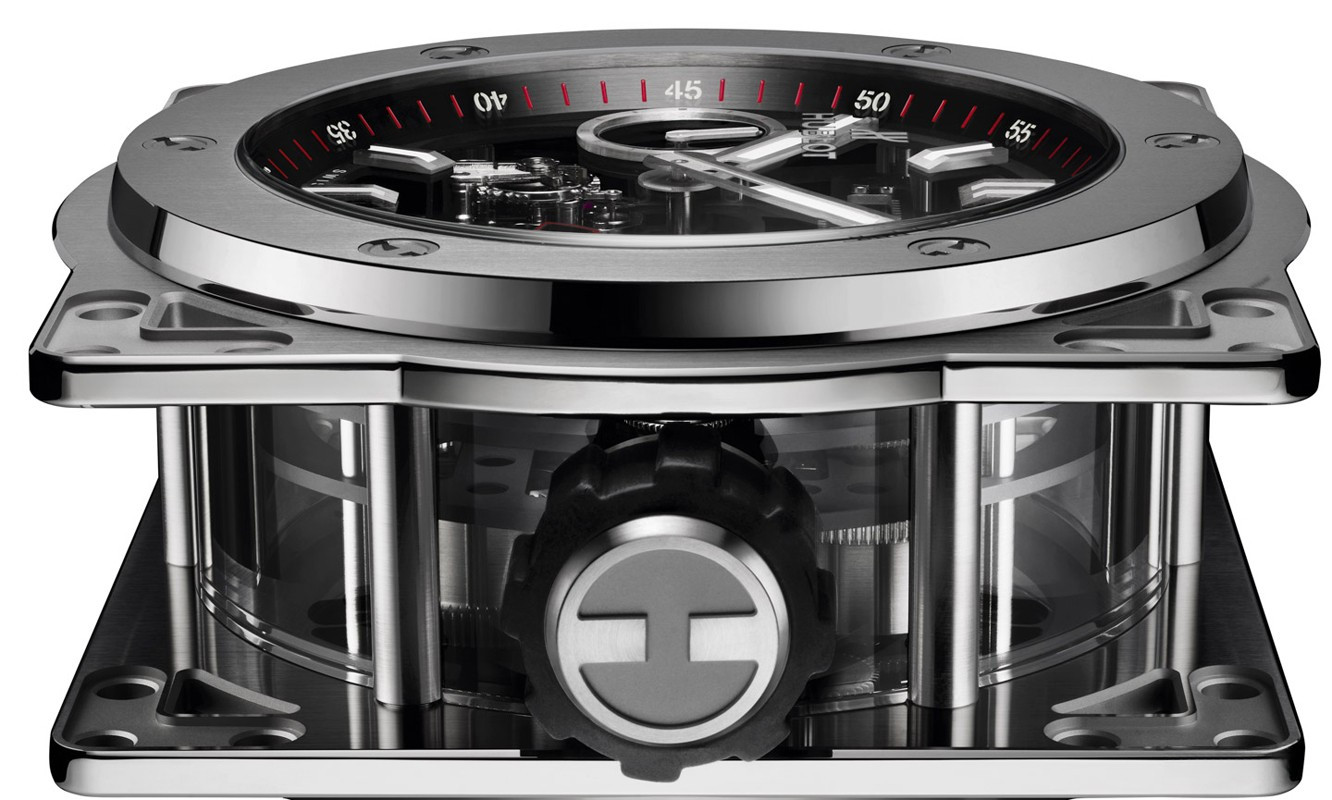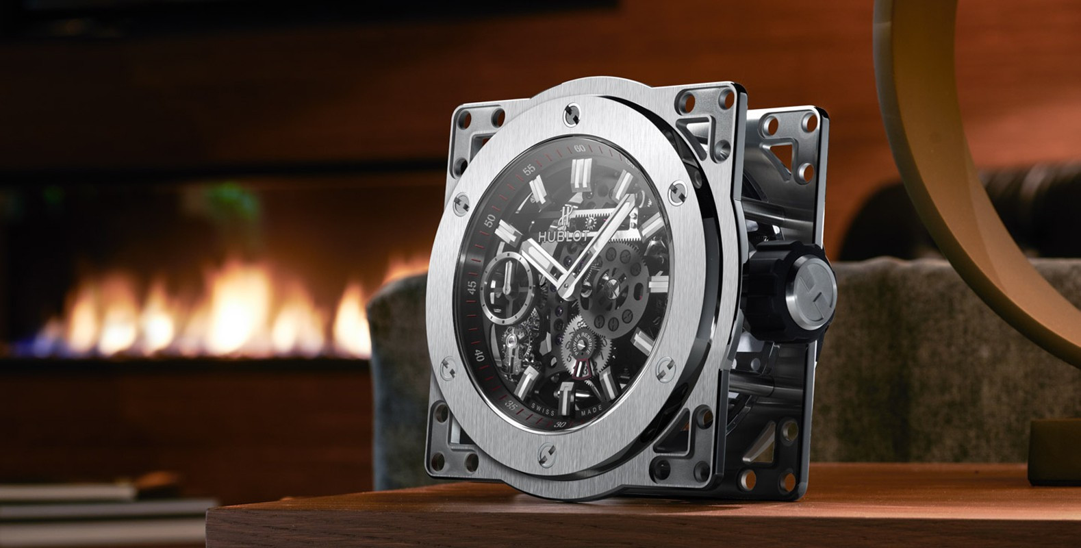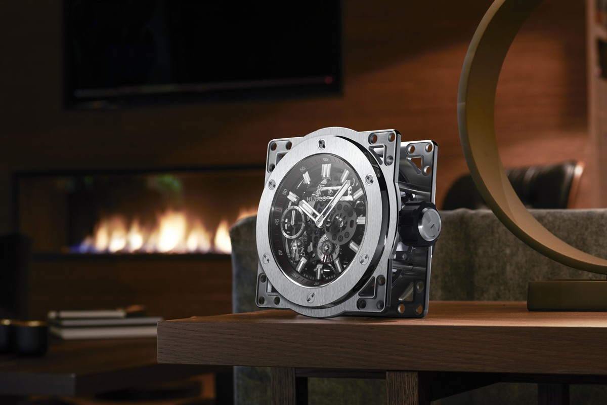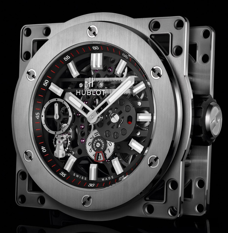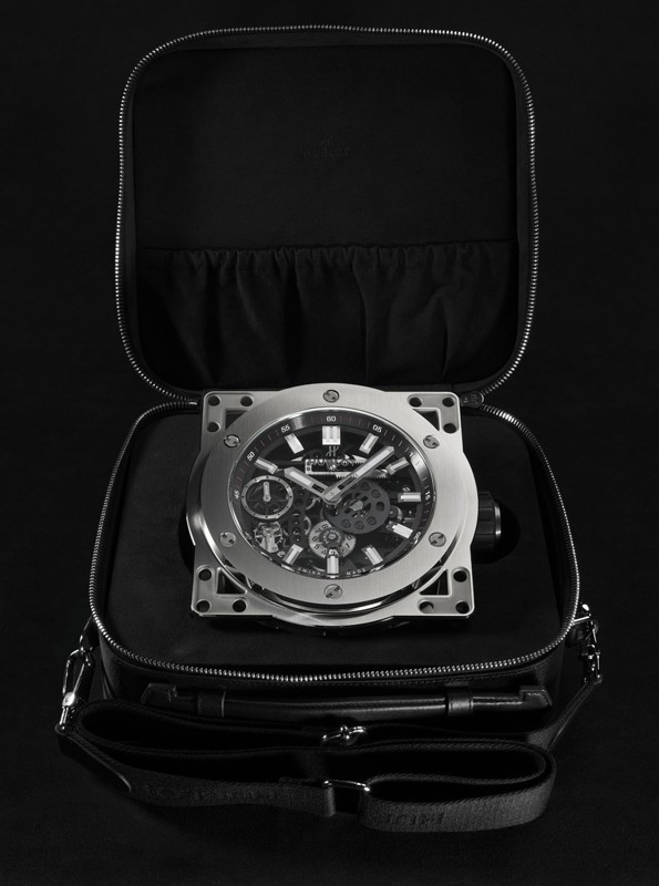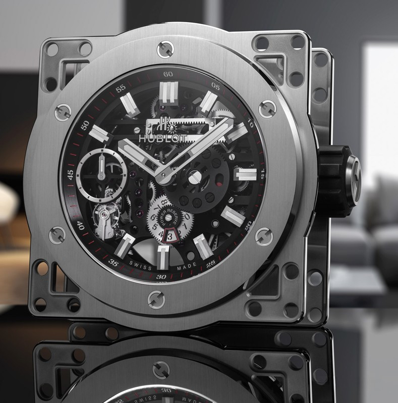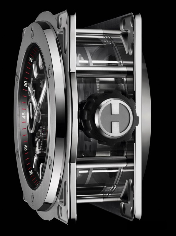 Часы Hublot Meca-10 Clock представлены в корпусе из нержавеющей стали с покрытием PVD размером 134.6 х 69.8 мм. Внутри корпуса установлен механизм с ручным заводом, обладающий запасом хода 10 дней. На черном циферблате отображаются часы, минуты, секунда, запас хода. Настольные часы.