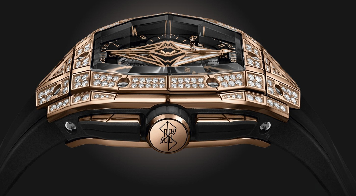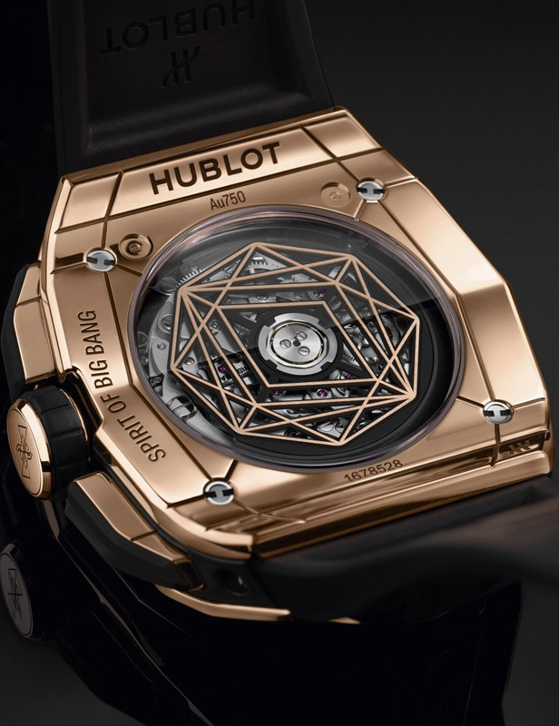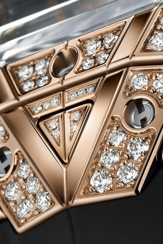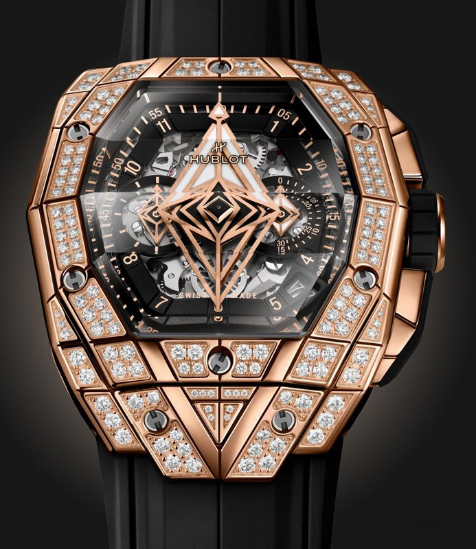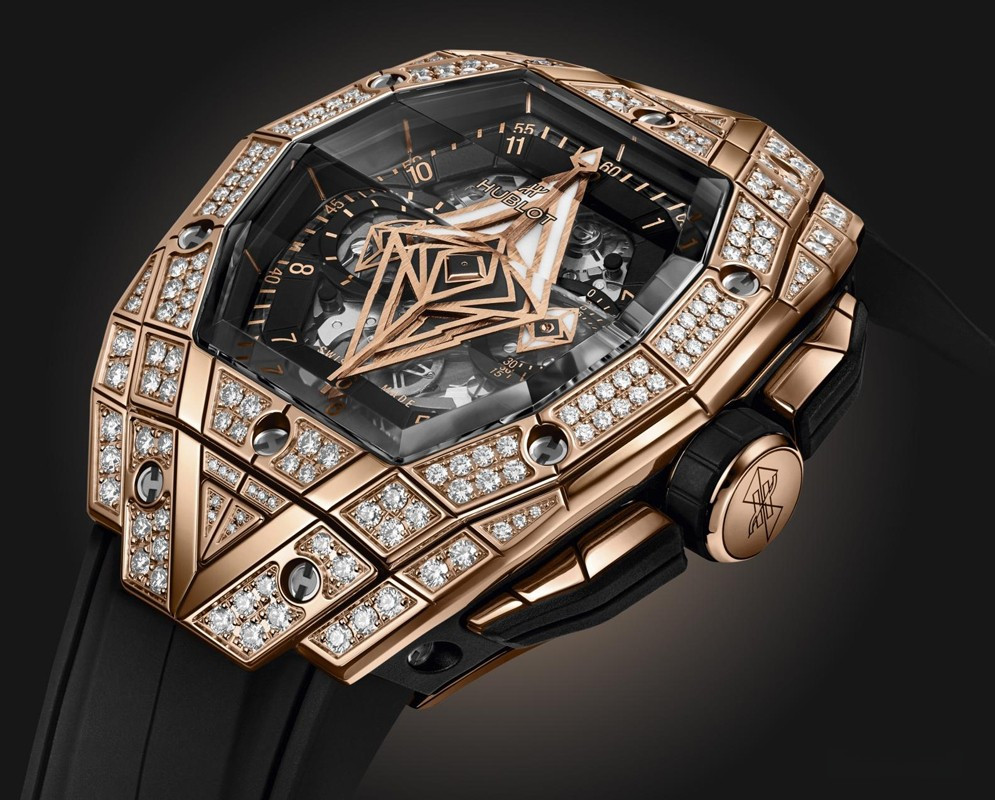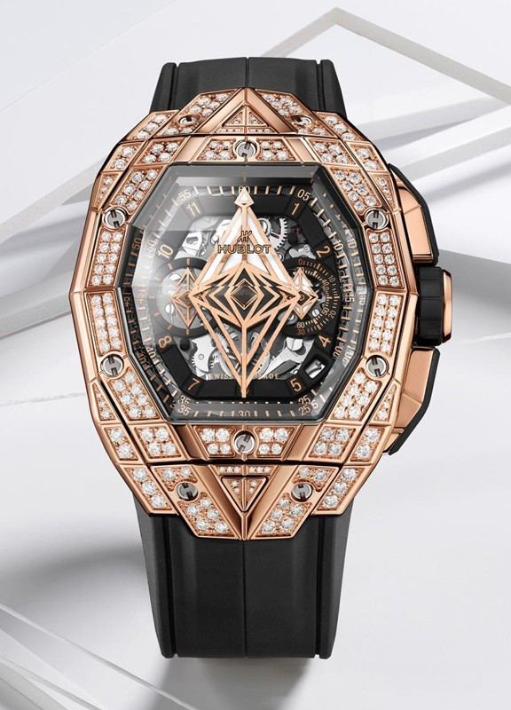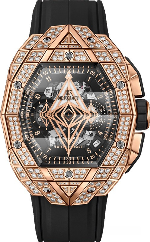 Часы Hublot Big Bang Sang Bleu 42 mm представлены в корпусе размером 42 мм из розового золота 18к водонепроницаемостью 100 метров. Внутри корпуса установлен автоматический механизм, Калибр HUB4700, обладающий запасом хода 50 часов. На черном циферблате отображаются часы, минуты, секунды, дата. Часы поставляются на каучуковом ремешке с золотой застежкой. Корпус инкрустирован белыми бриллиантами.
