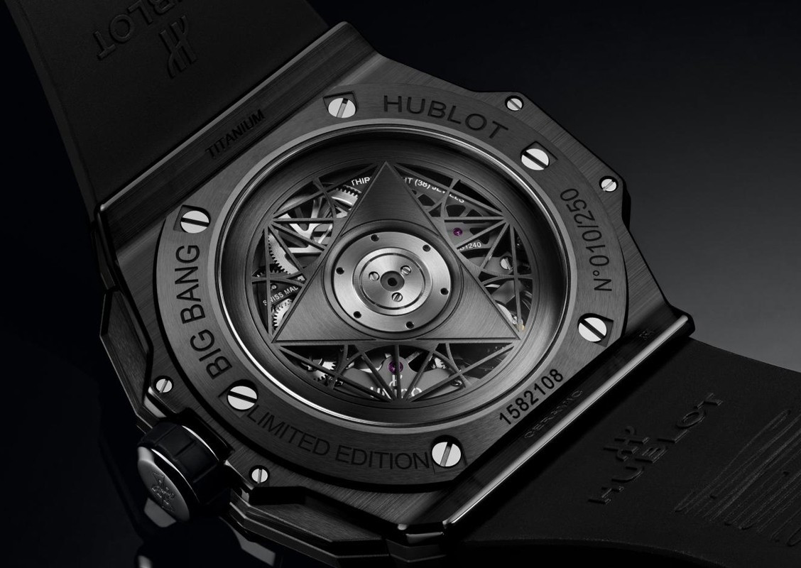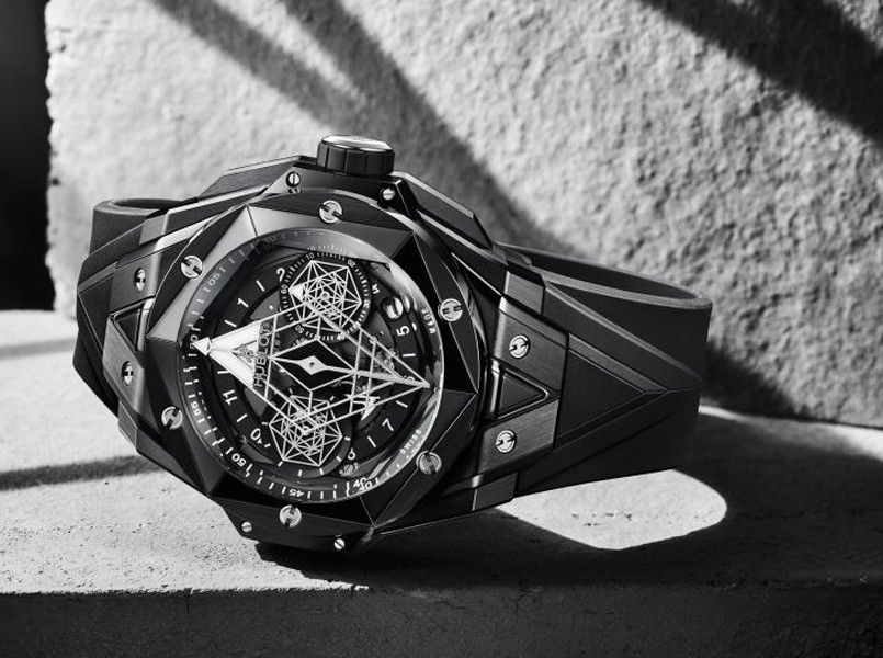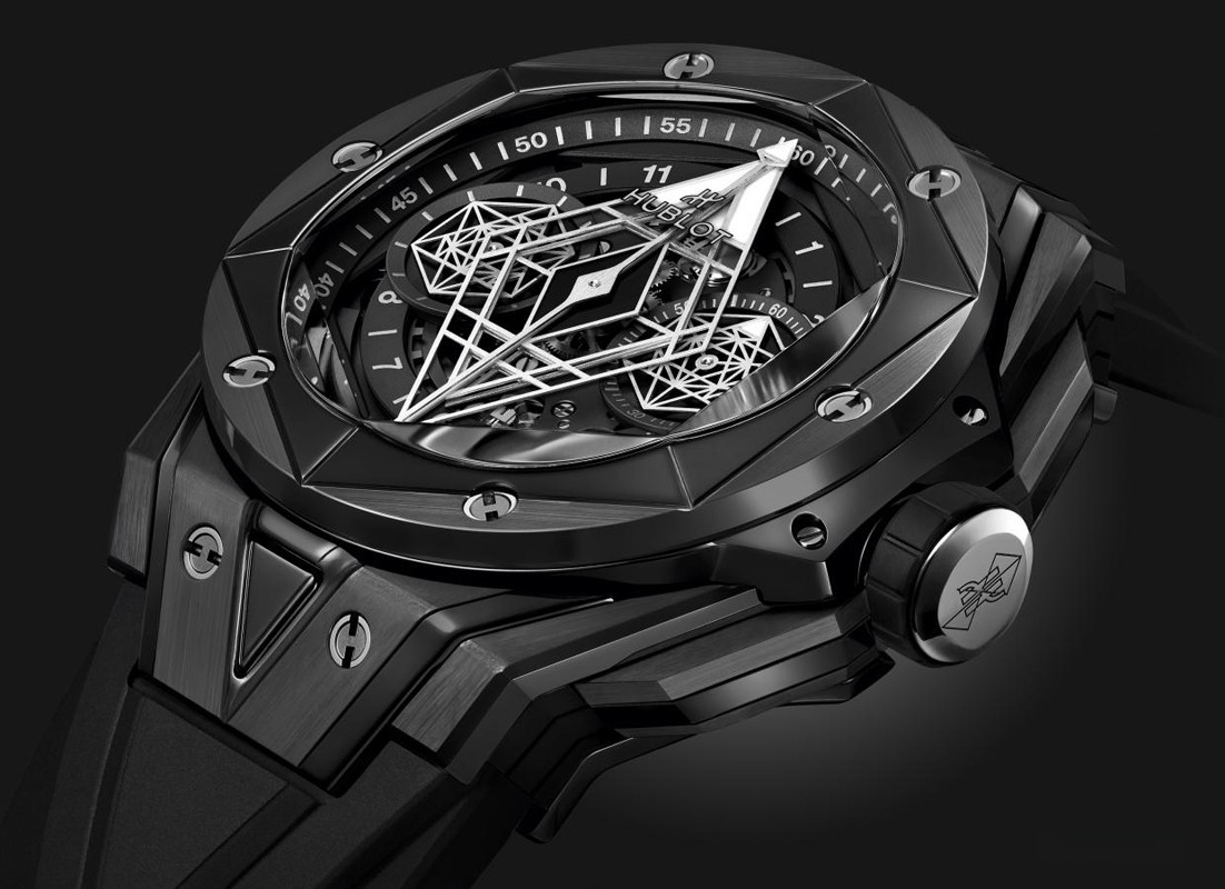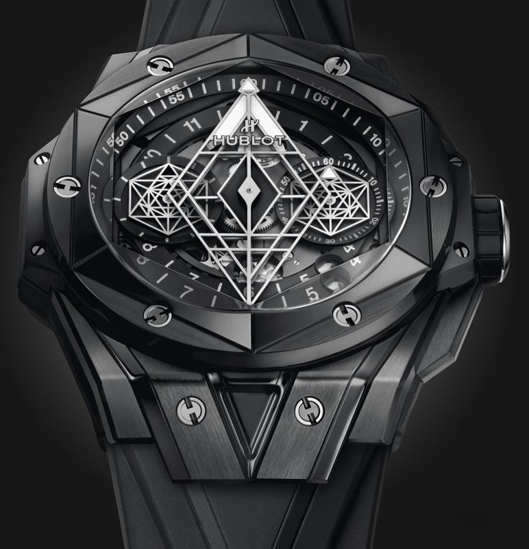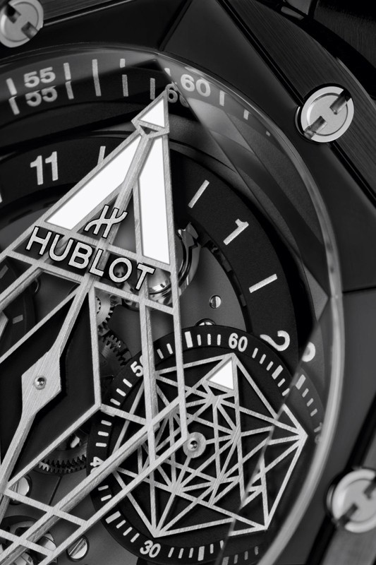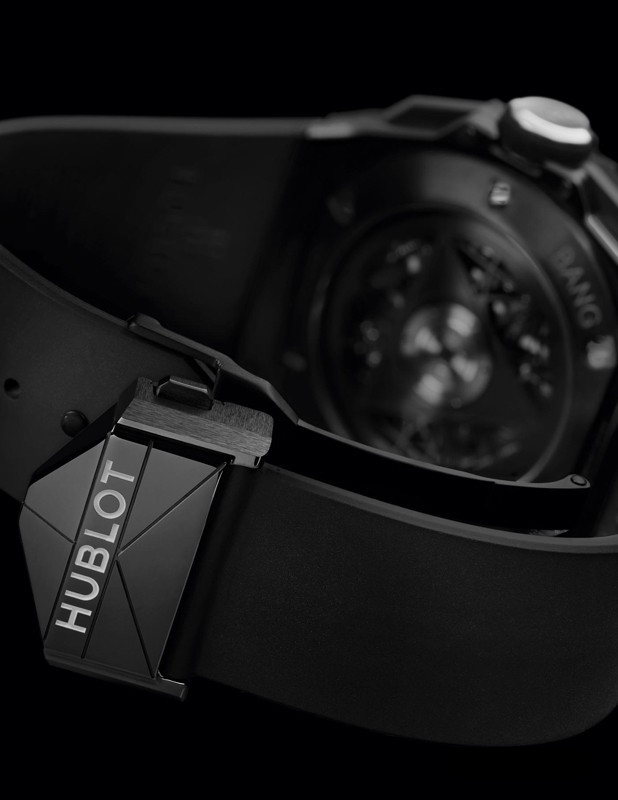 Часы Hublot Big Bang Sang Bleu II представлены в корпусе из керамики размером 45 х 16.5 мм воднепроницаемостью 100 метров. Внутри корпуса установлен автоматический механизм, Калибр HUB1240, обладающий запасом хода 72 часа. На черном скелетированном циферблате отображаются часы, минуты, секунды, дата, накопители хронографа. Часы поставляются на каучуковом ремешке с керамической застежкой. Серия ограничена - 250 шт.