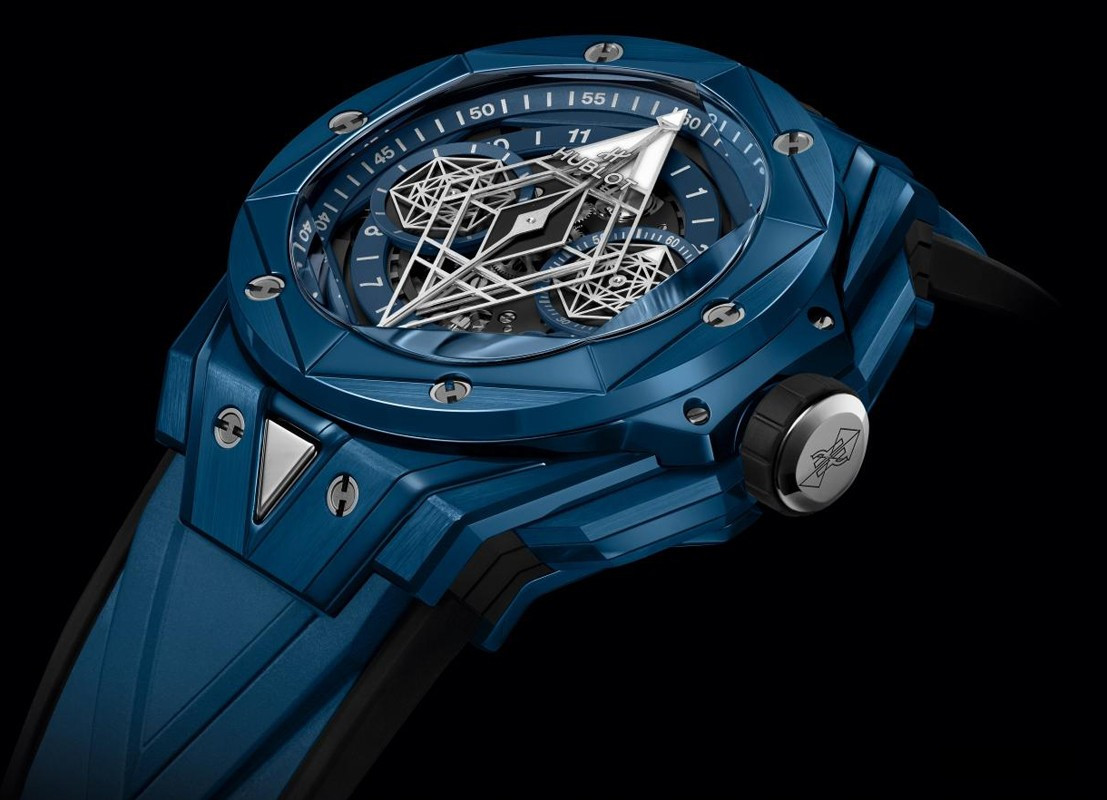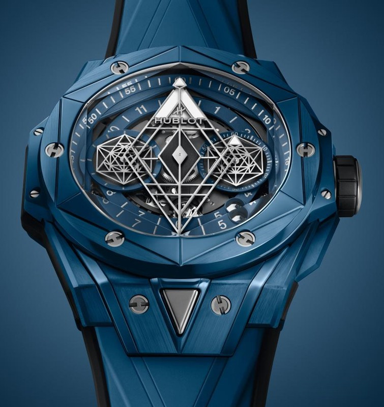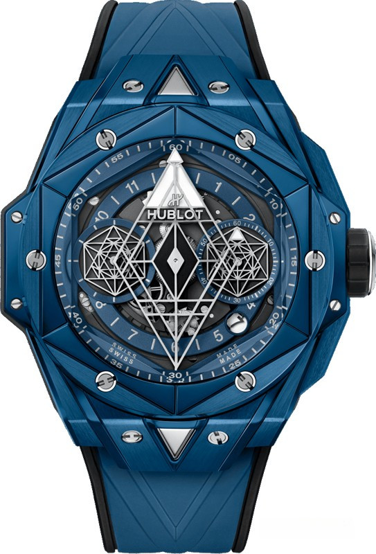 Часы Hublot Big Bang Sang Bleu II представлены в корпусе из керамики размером 45 х 16.5 мм воднепроницаемостью 100 метров. Внутри корпуса установлен автоматический механизм, Калибр HUB1240, обладающий запасом хода 72 часа. На синем скелетированном циферблате отображаются часы, минуты, секунды, дата, накопители хронографа. Часы поставляются на каучуковом ремешке с вставкой из титана. Серия ограничена - 200 шт.