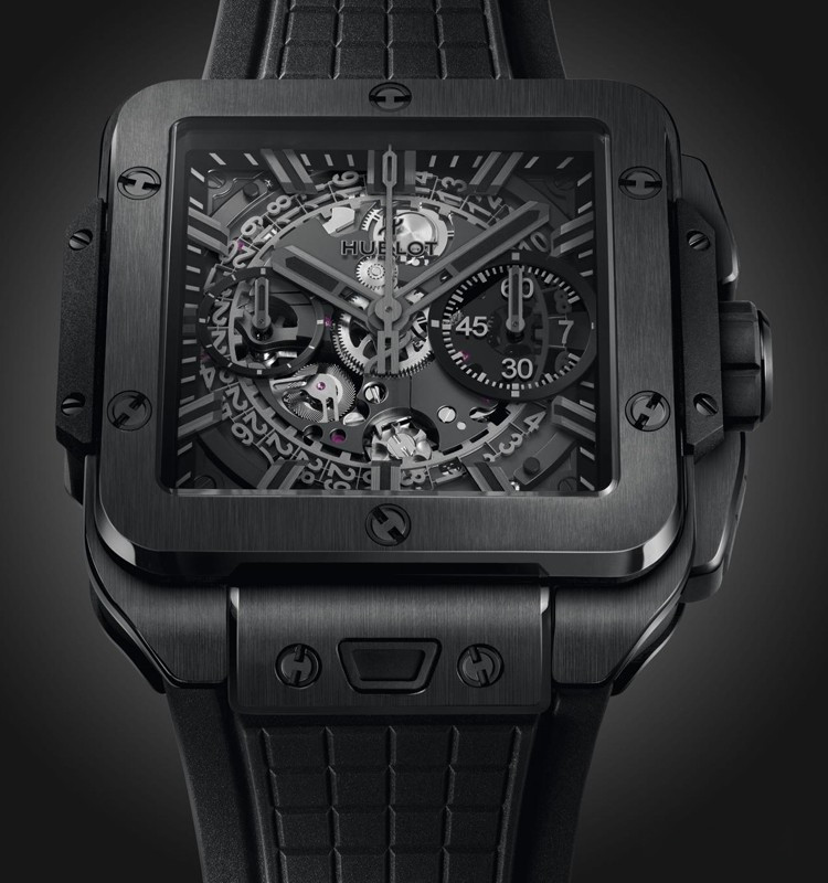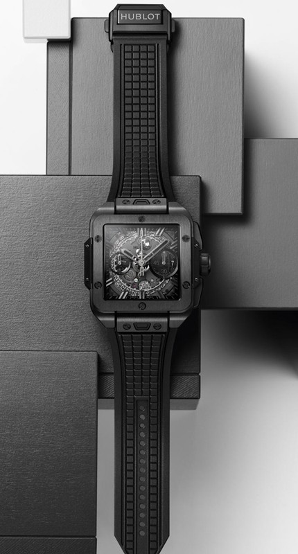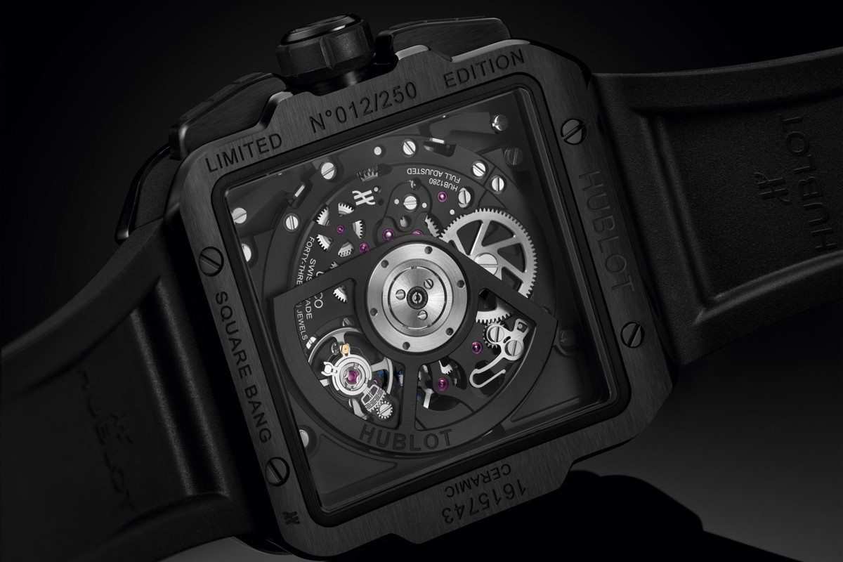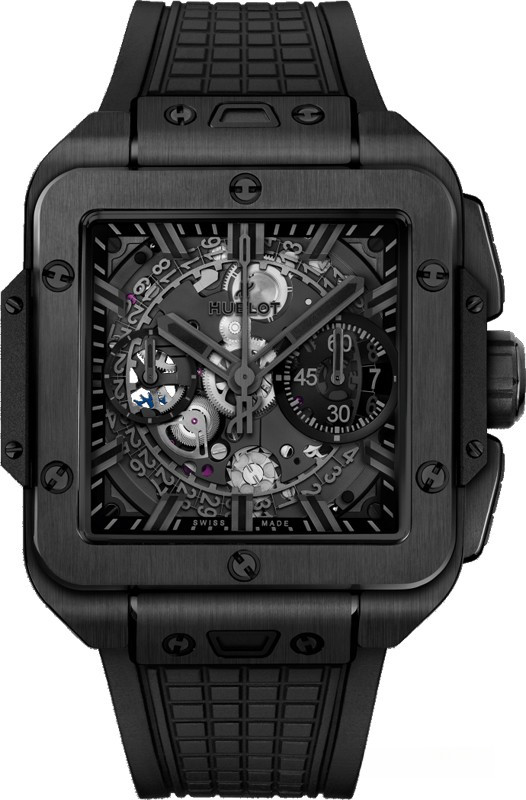 Часы Hublot Square Bang Unico 42 mm представлены в корпусе из керамики размером 42 мм водонепроницаемостью 100 метров. Внутри корпуса установлен автоматический механизм, Калибр HUB1280, обладающий запасом хода 72 часа. На черном скелетрованном циферблате отображаются часы, минуты, секунды, дата. Часы комплектуются каучуковым ремешком с титановой застежкой. Серия ограничена - 250 шт.