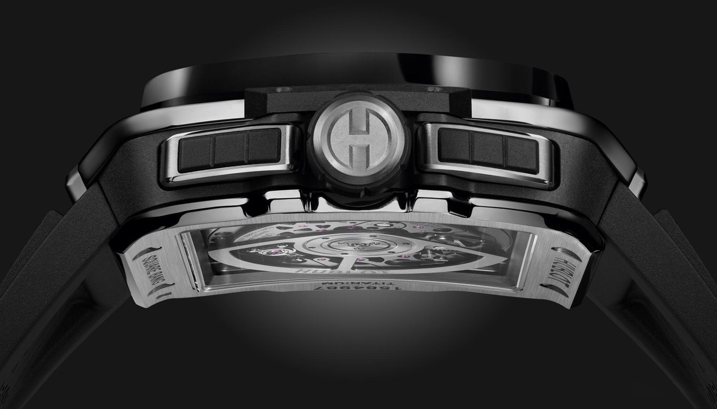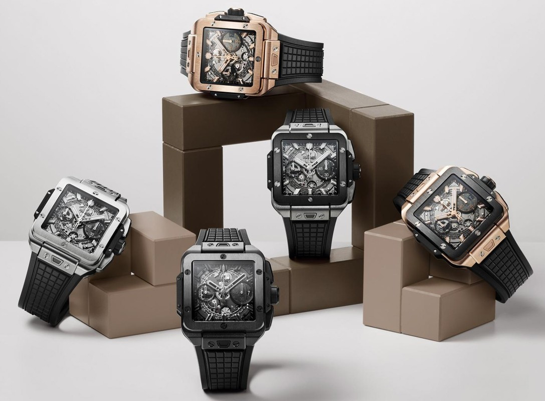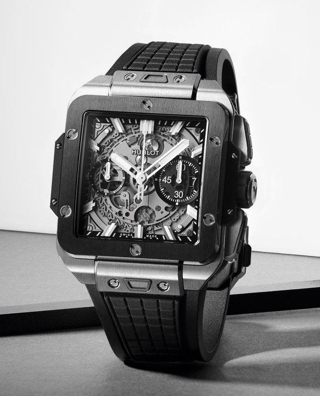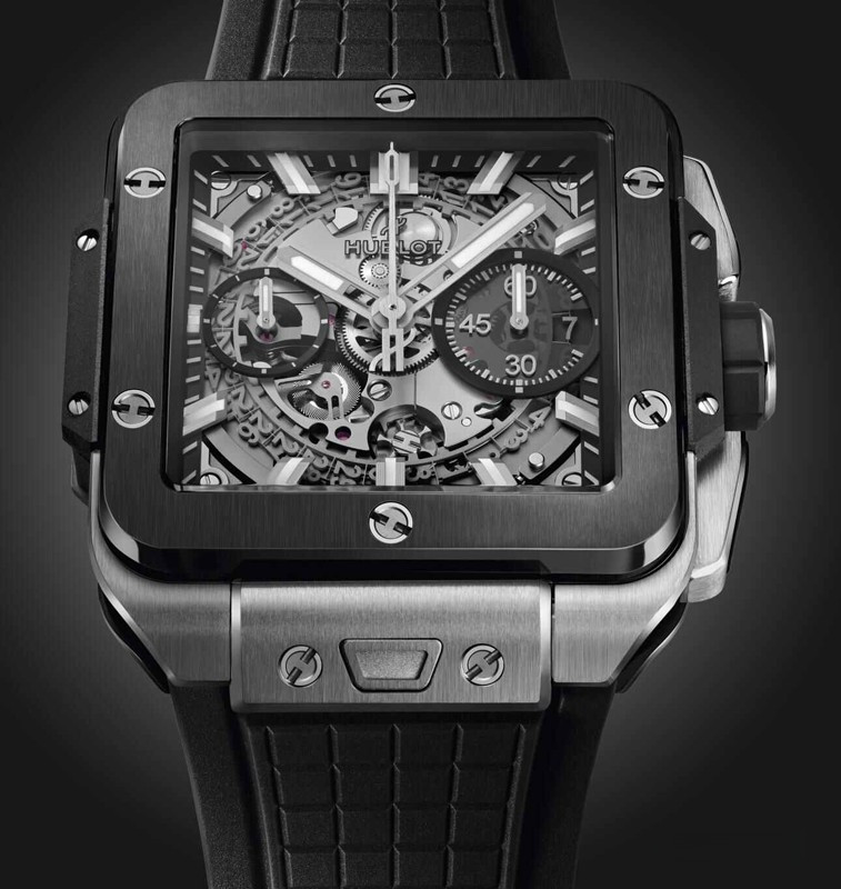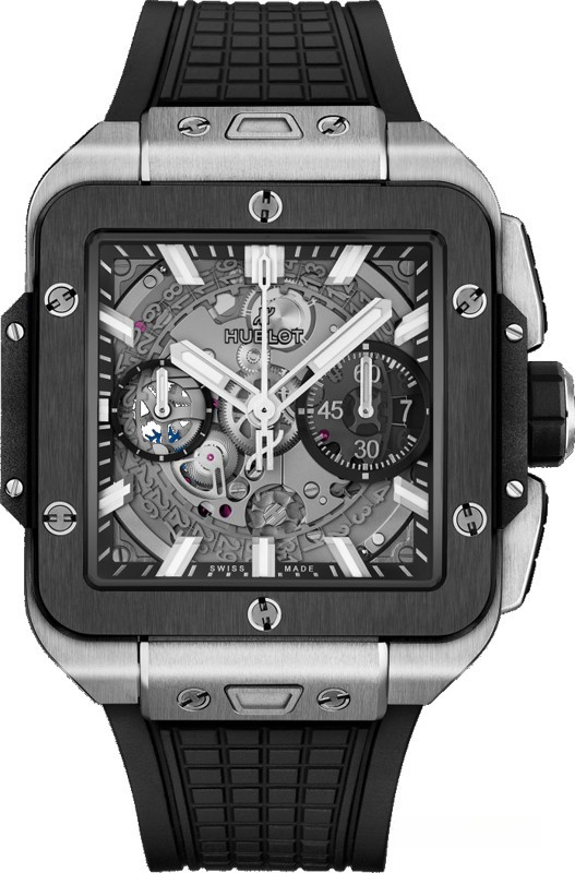 Часы Hublot Square Bang Unico 42 mm представлены в корпусе из титана и керамики размером 42 мм водонепроницаемостью 100 метров. Внутри корпуса установлен автоматический механизм, Калибр HUB1280, обладающий запасом хода 72 часа. На серебристом скелетрованном циферблате отображаются часы, минуты, секунды, дата. Часы комплектуются каучуковым ремешком с титановой застежкой.