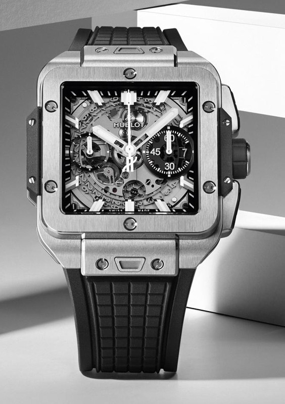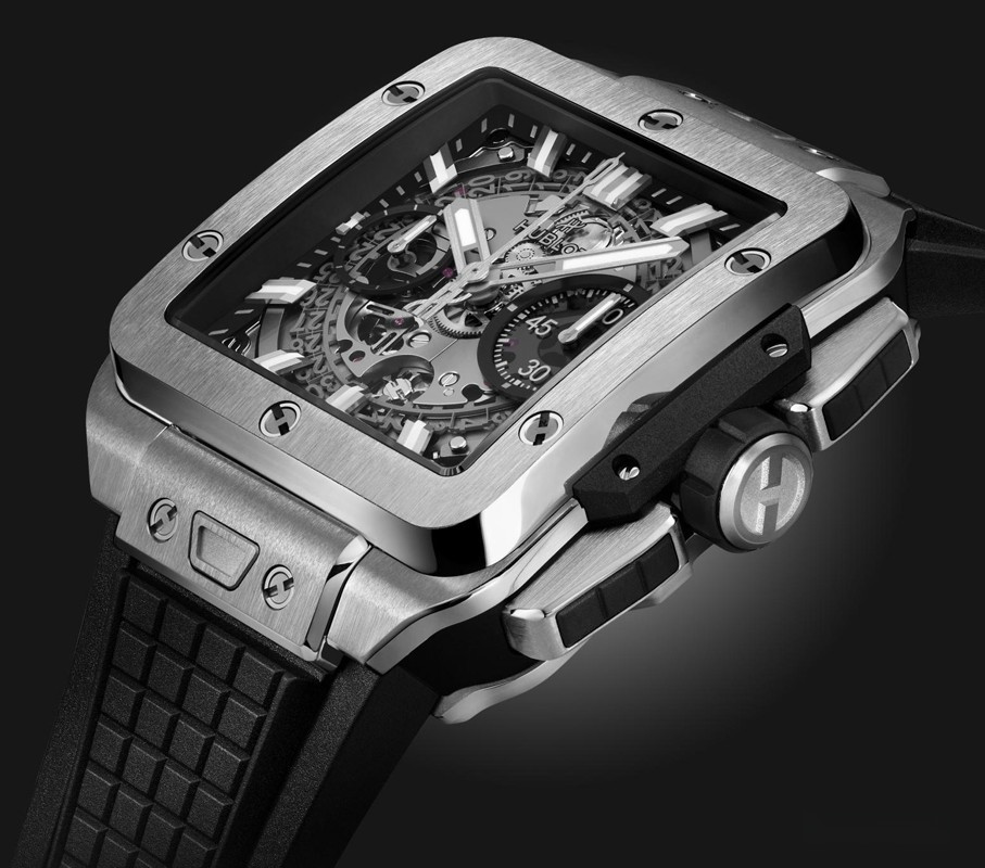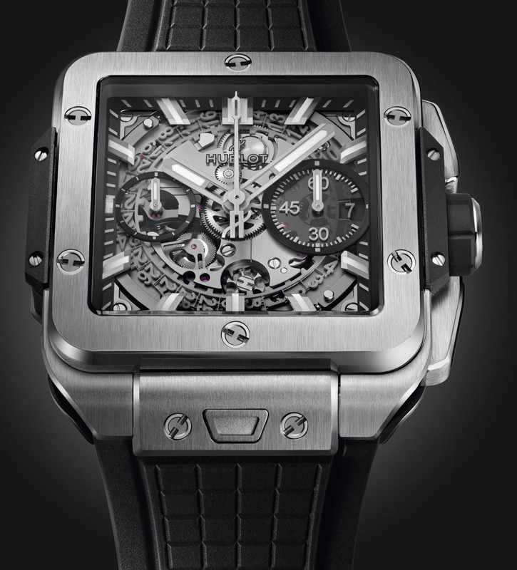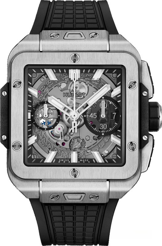 Часы Hublot Square Bang Unico 42 mm представлены в корпусе из титана размером 42 мм водонепроницаемостью 100 метров. Внутри корпуса установлен автоматический механизм, Калибр HUB1280, обладающий запасом хода 72 часа. На серебристом скелетрованном циферблате отображаются часы, минуты, секунды, дата. Часы комплектуются каучуковым ремешком с титановой застежкой.