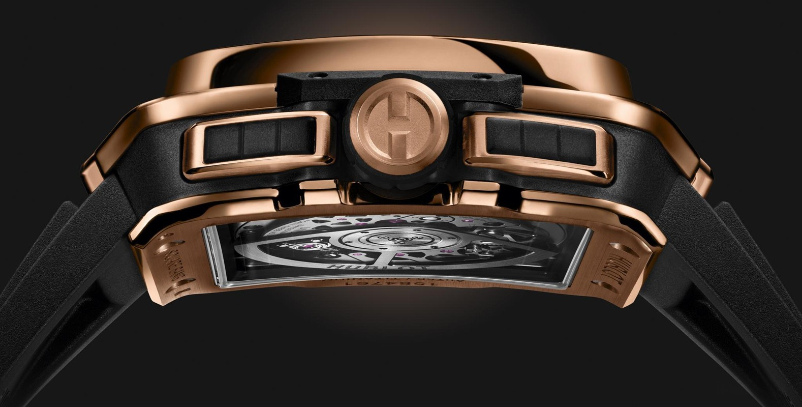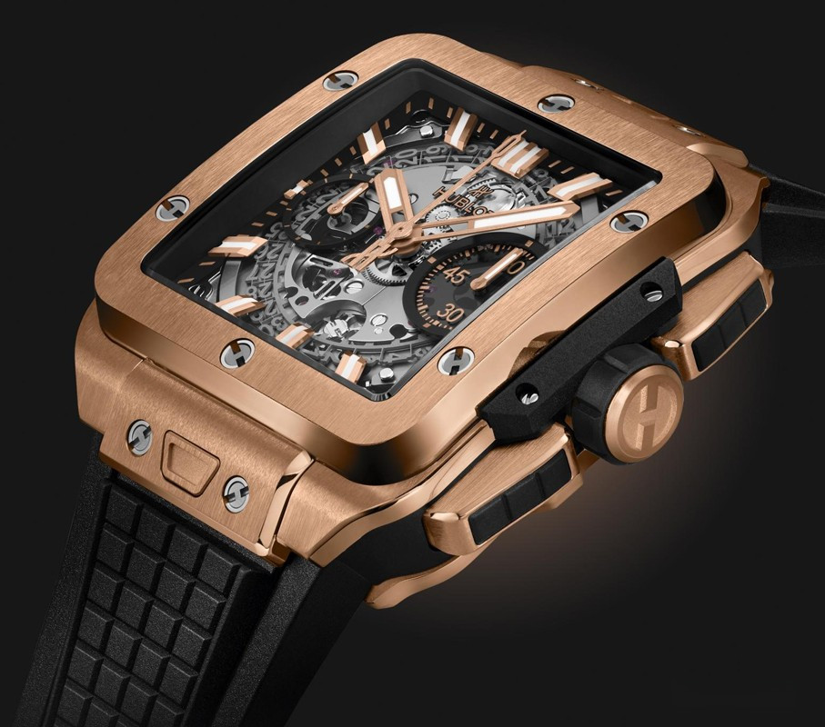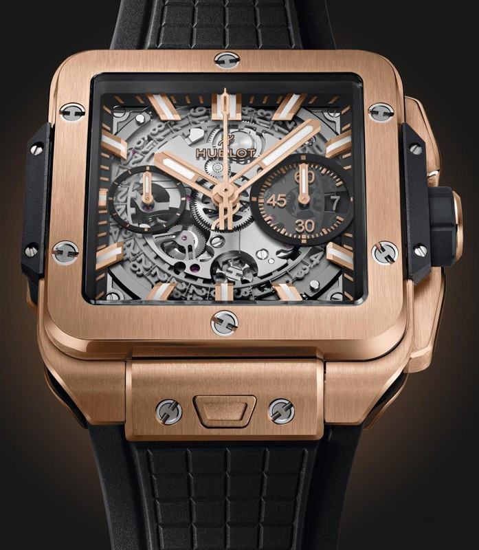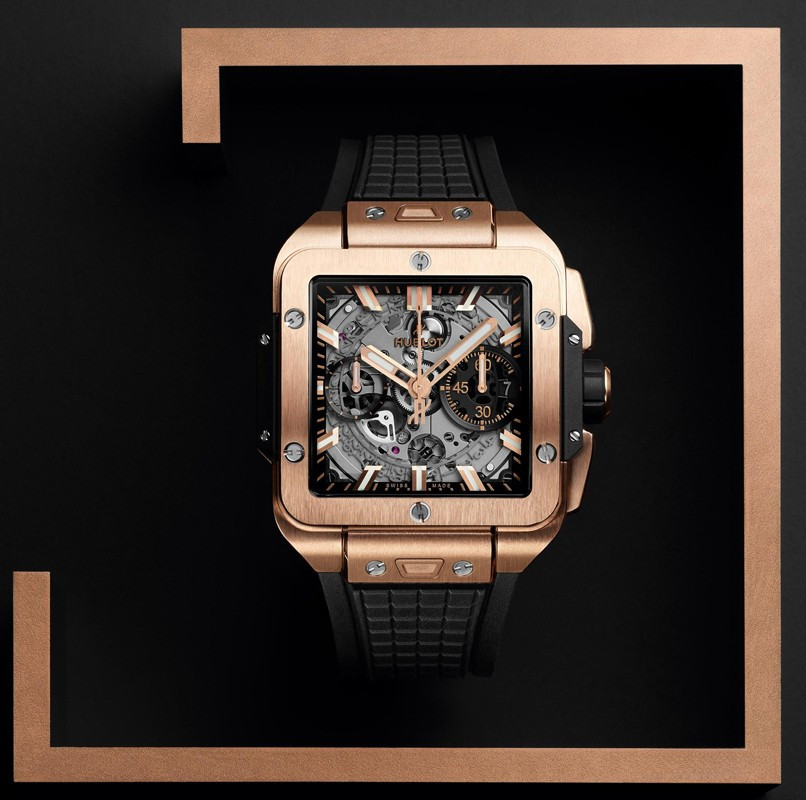 Часы Hublot Square Bang Unico 42 mm представлены в корпусе из розового золота 18к размером 42 мм водонепроницаемостью 100 метров. Внутри корпуса установлен автоматический механизм, Калибр HUB1280, обладающий запасом хода 72 часа. На серебристом скелетрованном циферблате отображаются часы, минуты, секунды, дата. Часы комплектуются каучуковым ремешком с золотой застежкой.