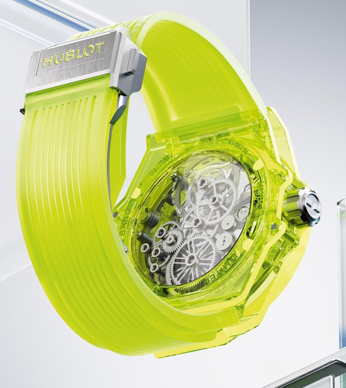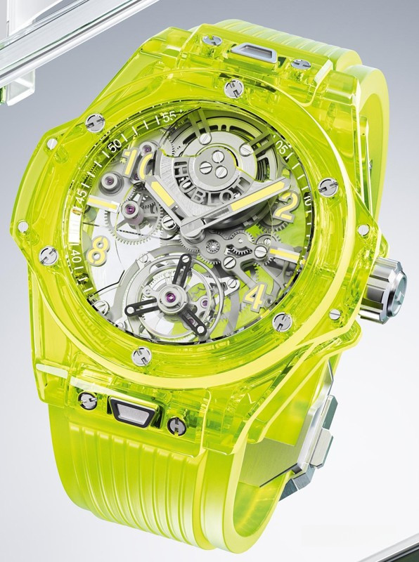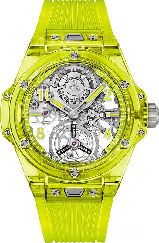 Часы Hublot Big Bang Tourbillon Automatic 44 mm представлены в корпусе из сапфира размером 44 мм водонепроницаемостью 30 метров. Внутри корпуса установлен автоматический механизм, Калибр HUB6035, обладающий запасом хода 72 часа. На серебристом скелетрованном циферблате отображаются часы, минуты, секунды, турбийон. Часы комплектуются каучуковым ремешком с титановой застежкой. Серия ограничена - 50 шт.