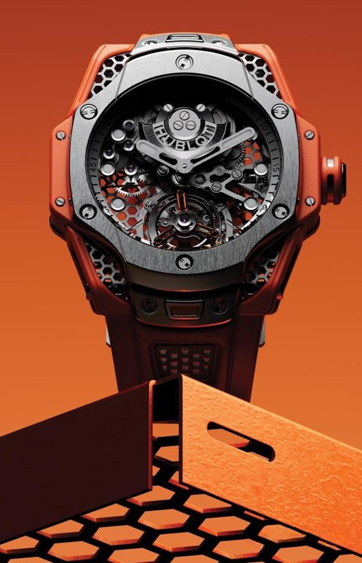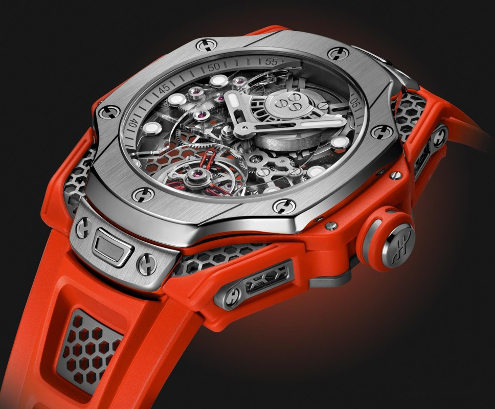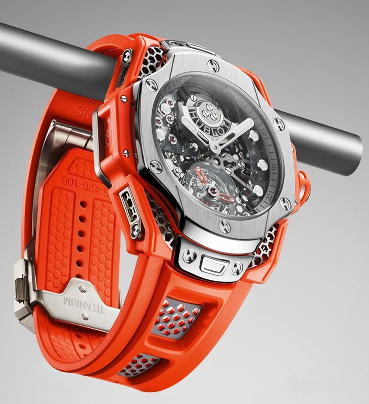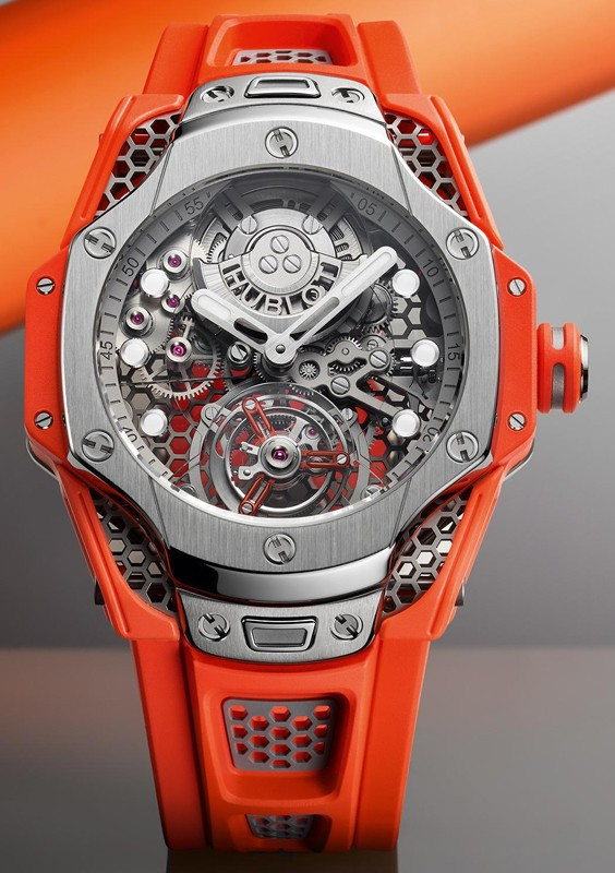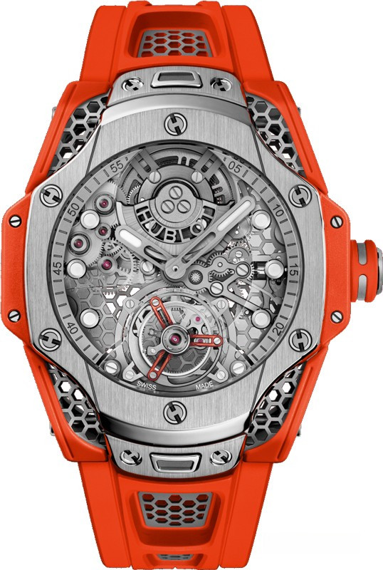 Часы Hublot Big Bang Tourbillon Samuel Ross 45 mm представлены в корпусе из титана размером 44 мм водонепроницаемостью 30 метров. Внутри корпуса установлен автоматический механизм, Калибр HUB6035 , обладающий запасом хода 72 часа. На сером скелетрованном циферблате отображаются часы, минуты, секунды, турбийон. Часы комплектуются каучуковым ремешком с титановой застежкой. Серия ограничена - 50 шт.