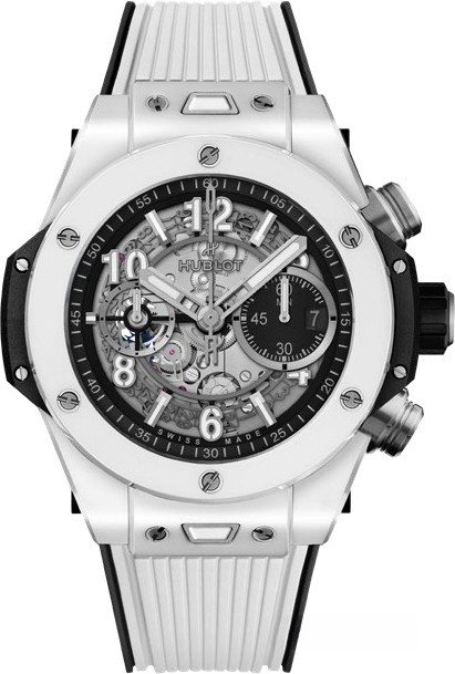 Часы Hublot Big Bang Unico 44 mm представлены в корпусе из керамики размером 44 х 14.5 мм водонепроницаемостью 100 метров. Внутри корпуса находится автоматический механизм, Калибр HUB1280, обладающий запсом хода 72 часа. На серебристом скелетированном циферблате отображаются часы, минуты, секунды, даты, накопители хронографа. Часы поставляются на каучуковом ремешке с вставкой из керамики.