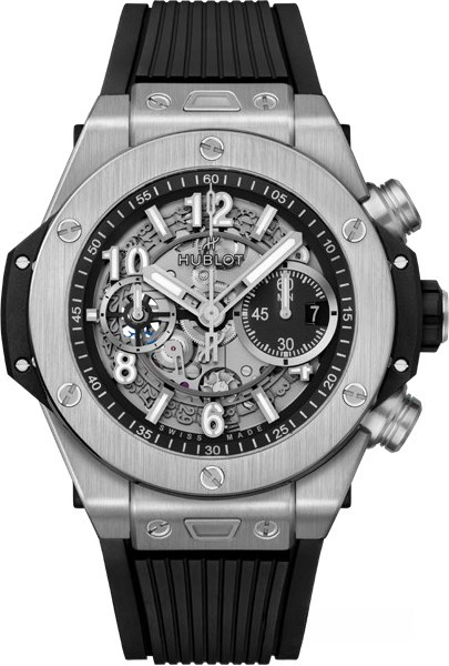 Часы Hublot Big Bang Unico 44 mm представлены в корпусе из титана размером 44 х 14.5 мм водонепроницаемостью 100 метров. Внутри корпуса находится автоматический механизм, Калибр HUB1280, обладающий запсом хода 72 часа. На серебристом скелетированном циферблате отображаются часы, минуты, секунды, даты, накопители хронографа. Часы поставляются на каучуковом ремешке с вставкой из титана.