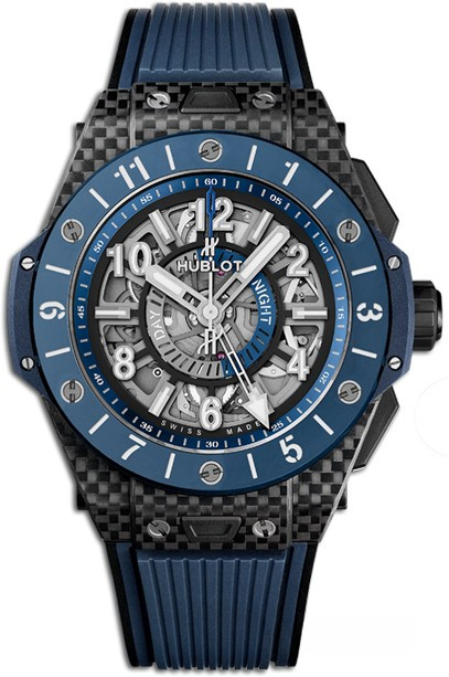 Часы представлены в корпусе из керамики и карбона размером 45 х 15.85 мм и водонепроницеамостью 100 метров. Внутри корпуса установлен автоматический механизм Калибр HUB 1251 UNICO с запасом хода 72 часа. На серебристом скелетированном циферблате отображаются часы, минуты, секунды, индикатор день/ночь, время второго часового пояса. Часы комплектуются синим каучуковым ремешком с титановой вставкой.