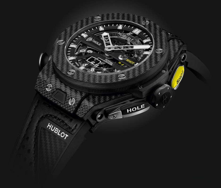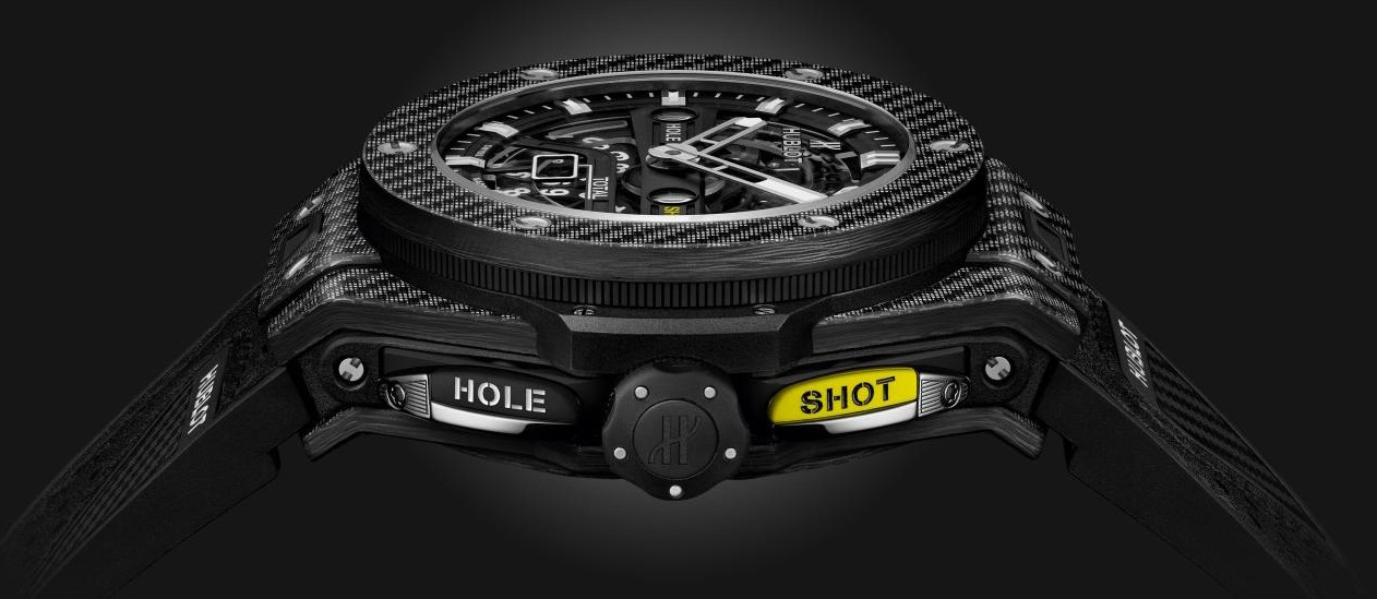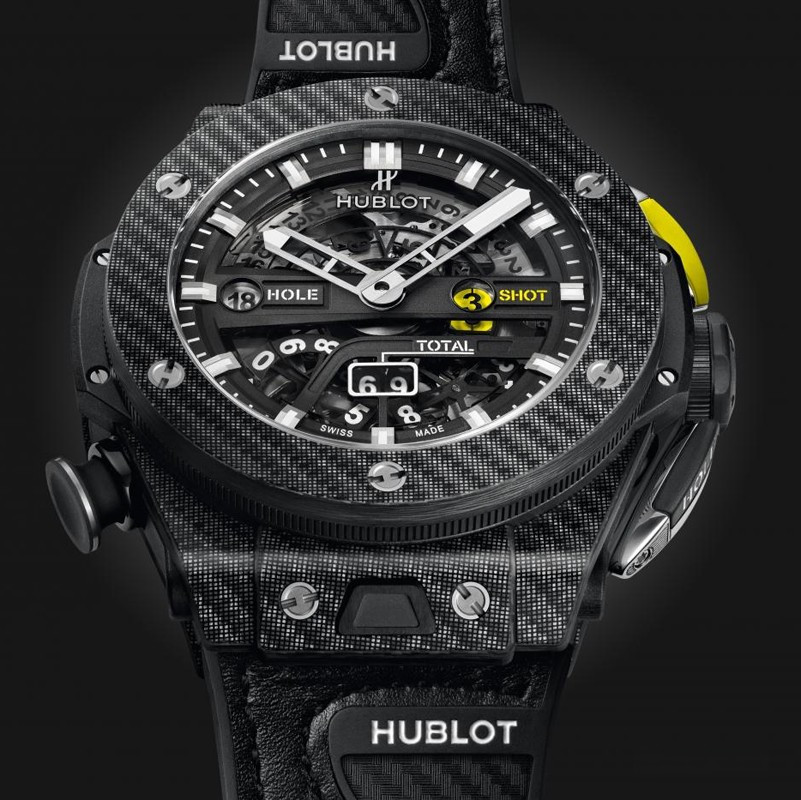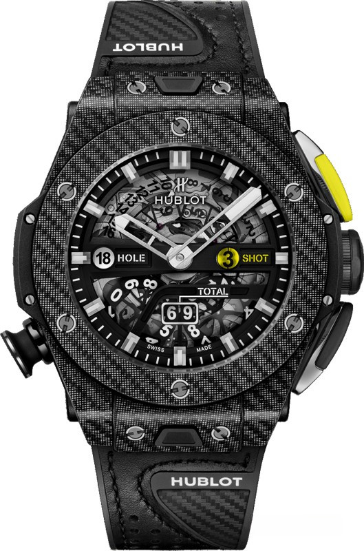 Big Bang Unico Golf имеет вид хронографа и был задуман как хронограф. В его механизме имеется функция возврата к нулю, которая обеспечивает надежный механизм счета. Кнопка на 2-х часах активирует механизм отображения количества ударов и подсчет забитых шаров. Кнопка на 4-х часах позволяет владельцу начать новый отсчет, сбросив счетчик хода до нуля. Счетчик на 6-ти часах отображает общее количество ударов и одновременно обновляется. Кнопка на 8-ми сбрасывает механизм и устанавливает счетчики на ноль в конце раунда. Во время раунда эту кнопку можно заблокировать, повернув ее на 45 °, тем самым гарантируя, что она не будет непреднамеренно активирована. Hublot разработали и создали модуль к новому механизму Unico, который был специально изготовлен для игры в гольф. Калибр MHUB1580 позволяет игрокам легко рассчитывать свой балл. Корпус часов Big Bang Unico Golf изготовлен из карбона. Скелетированный механизм MHUB1580 позволяет владельцу наблюдать за работой часов. Модель поставляется на кожаном ремешке с титановой вставкой. Дизайн ремешка напоминает перчатку для гольфа.