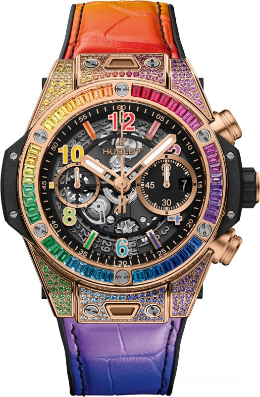 Часы Hublot Big Bang Unico Rainbow Chronograph 42 mm представлены в корпусе из розового золота 18к размером 42 мм водонепроницаемостью 100 метров. Внутри корпуса установлен автоматический механизм, Калибр HUB1280, обладающий запасом хода 72 часа. На черном циферблате отображаются часы, минуты, секунды, дата, накопители хронографа. Часы комплектуются ремешком из каучука и кожи аллигатора с золотой застежкой. Корпус инкрустирован 170 камнями: рубины, розовые сапфиры, аметисты, синие сапфиры, синие топазы, цавориты, желтые и оранжевые сапфиры.