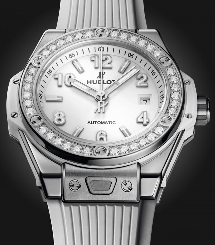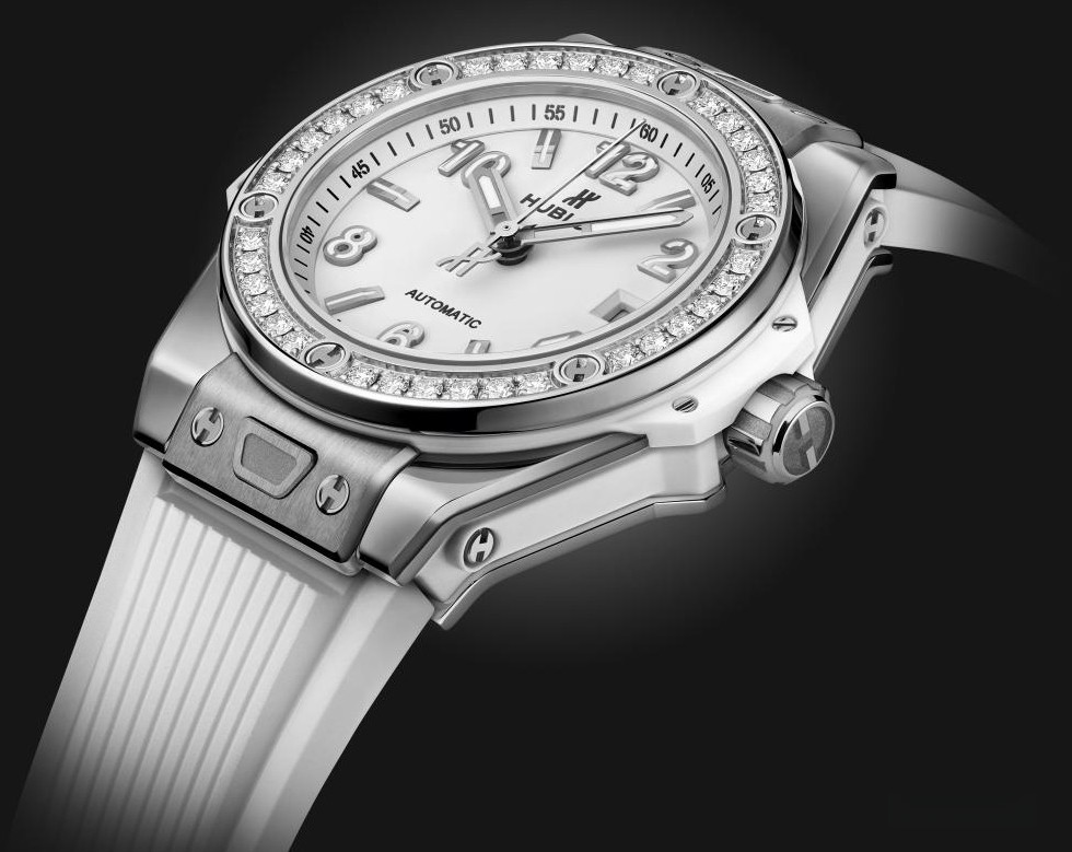 Часы Hublot Big Bang One Click 33 mm представлены в корпусе диаметром 33 мм из нержавеющей стали водонепроницаемостью 100 метров. Внутри корпуса установлен автоматический механизм, Калибр HUB1120, обладающий запасом хода 40 часов. На белом циферблате отображаются часы, минуты, секунды, дата. Часы поставляются на каучуковом ремешке с вставкой из нержавеющей стали. Безель из белых бриллиантов.