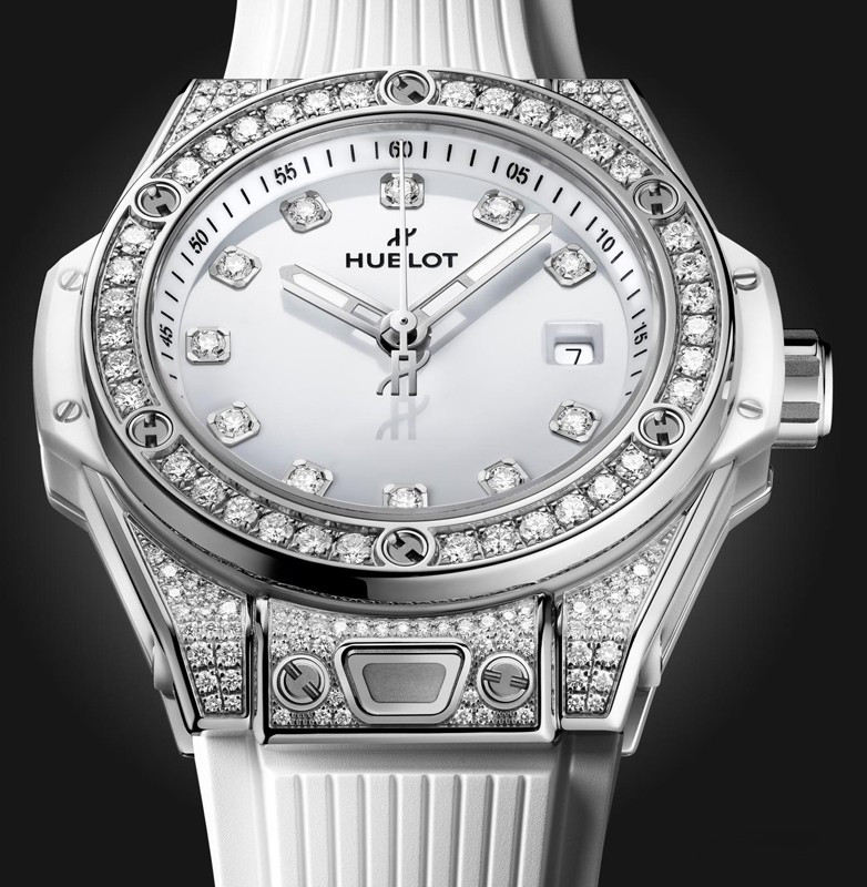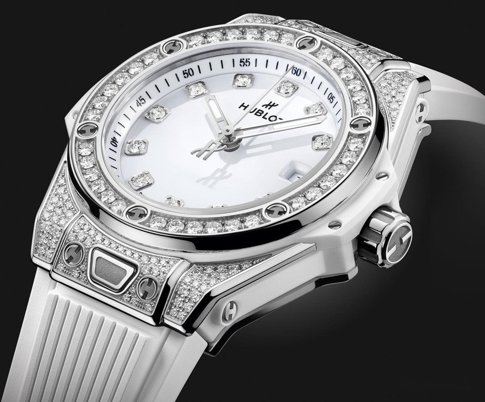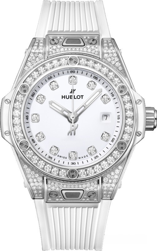 Часы Hublot Big Bang One Click 33 mm представлены в корпусе диаметром 33 мм из нержавеющей стали водонепроницаемостью 100 метров. Внутри корпуса установлен автоматический механизм, Калибр HUB1120, обладающий запасом хода 40 часов. На белом циферблате с 10-ю белыми бриллиантами отображаются часы, минуты, секунды, дата. Часы поставляются на каучуковом ремешке с застежкой из нержавеющей стали. Корпус инкрустирован белыми бриллиантами.