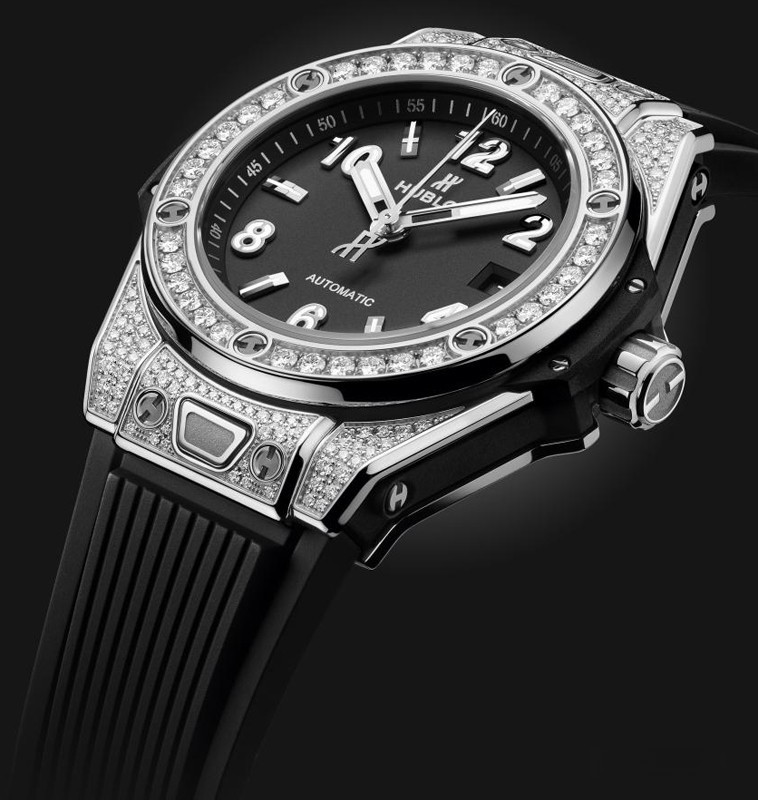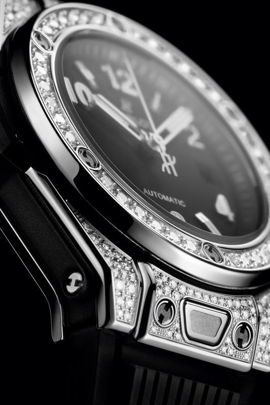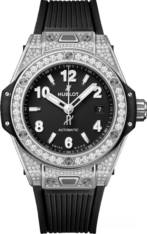 Часы Hublot Big Bang One Click 33 mm представлены в корпусе диаметром 33 мм из нержавеющей стали водонепроницаемостью 100 метров. Внутри корпуса установлен автоматический механизм, Калибр HUB1120, обладающий запасом хода 40 часов. На черном циферблате отображаются часы, минуты, секунды, дата. Часы поставляются на каучуковом ремешке с вставкой из нержавеющей стали. Корпус инкрустирован белыми бриллиантами.