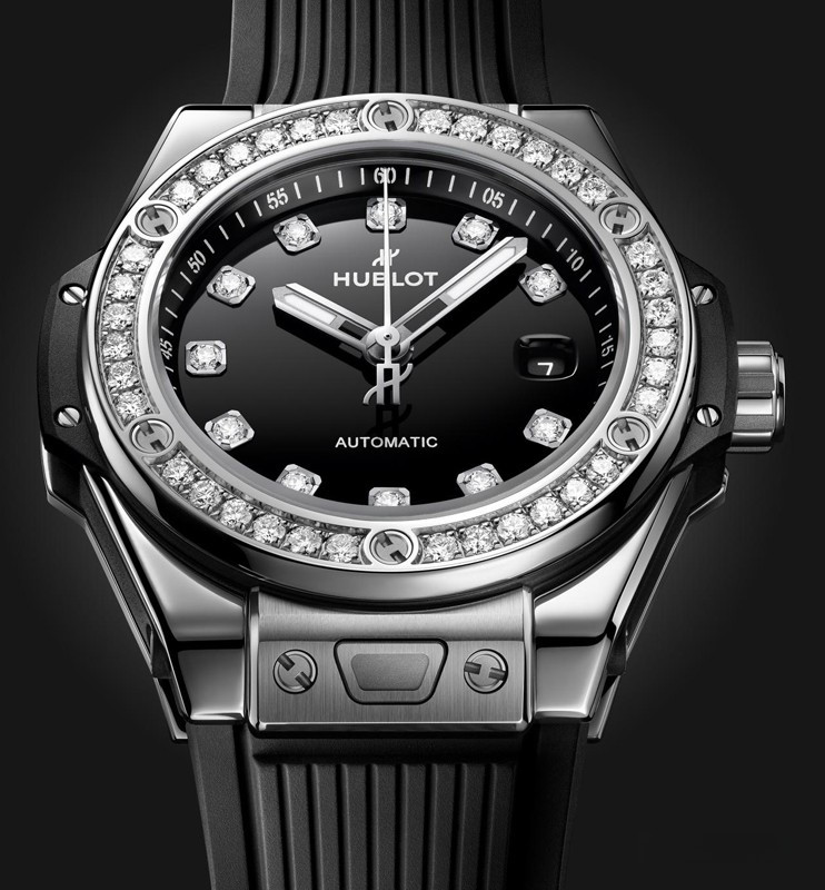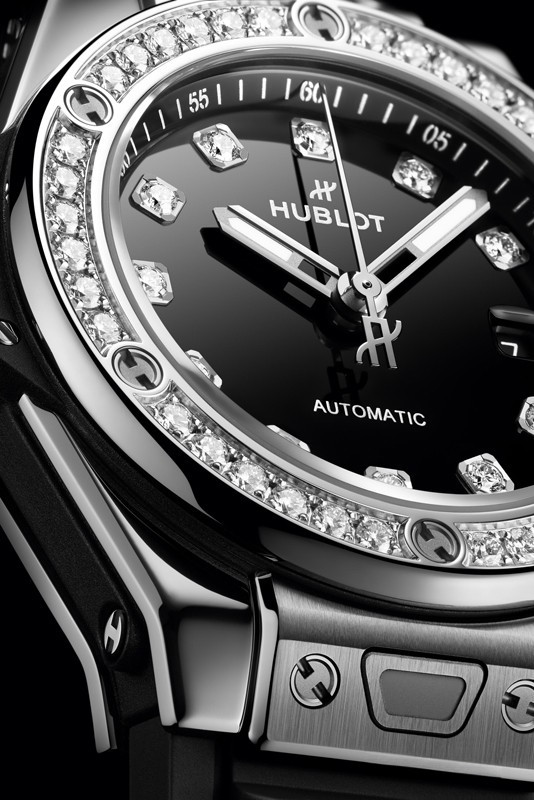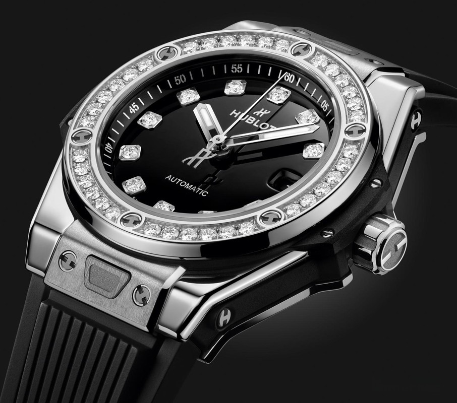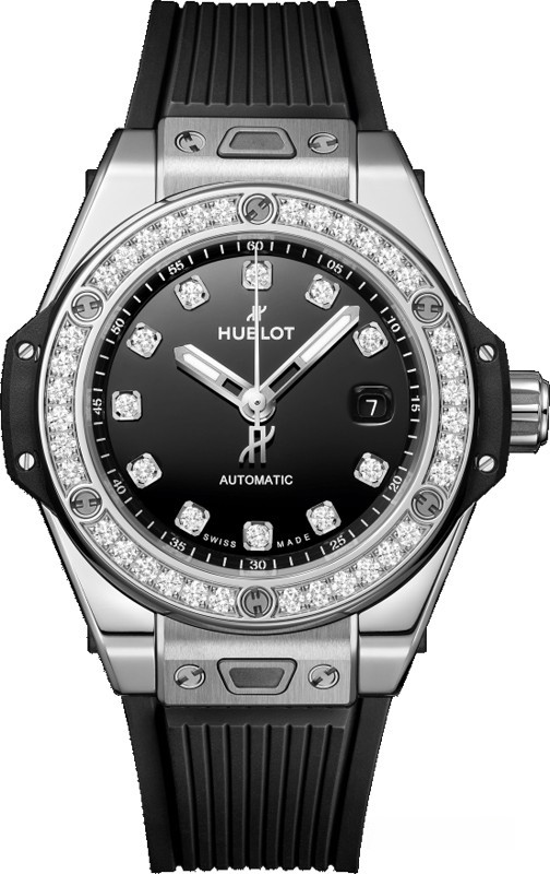 Часы Hublot Big Bang One Click 33 mm представлены в корпусе диаметром 33 мм из нержавеющей стали водонепроницаемостью 100 метров. Внутри корпуса установлен автоматический механизм, Калибр HUB1120, обладающий запасом хода 40 часов. На черном циферблате с 11-ю белыми бриллиантами отображаются часы, минуты, секунды, дата. Часы поставляются на каучуковом ремешке с застежкой из нержавеющей стали. Безель из белых бриллиантов.