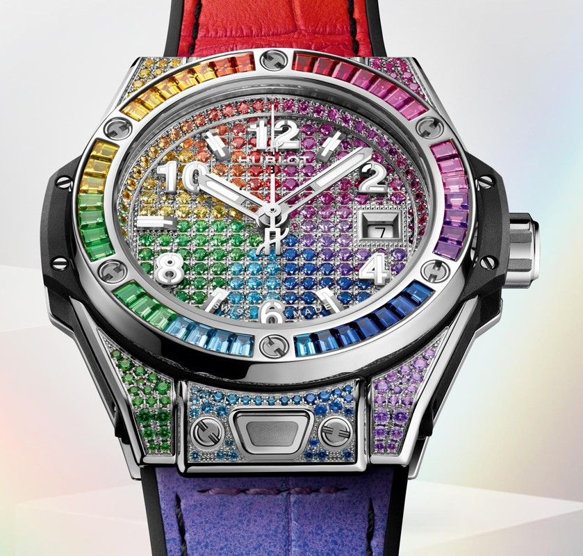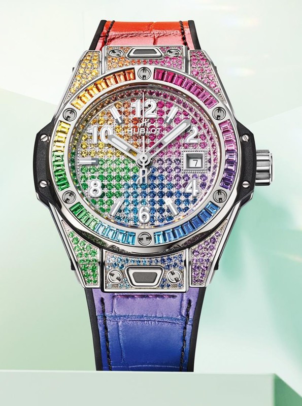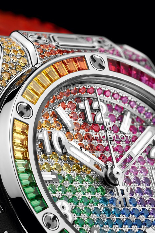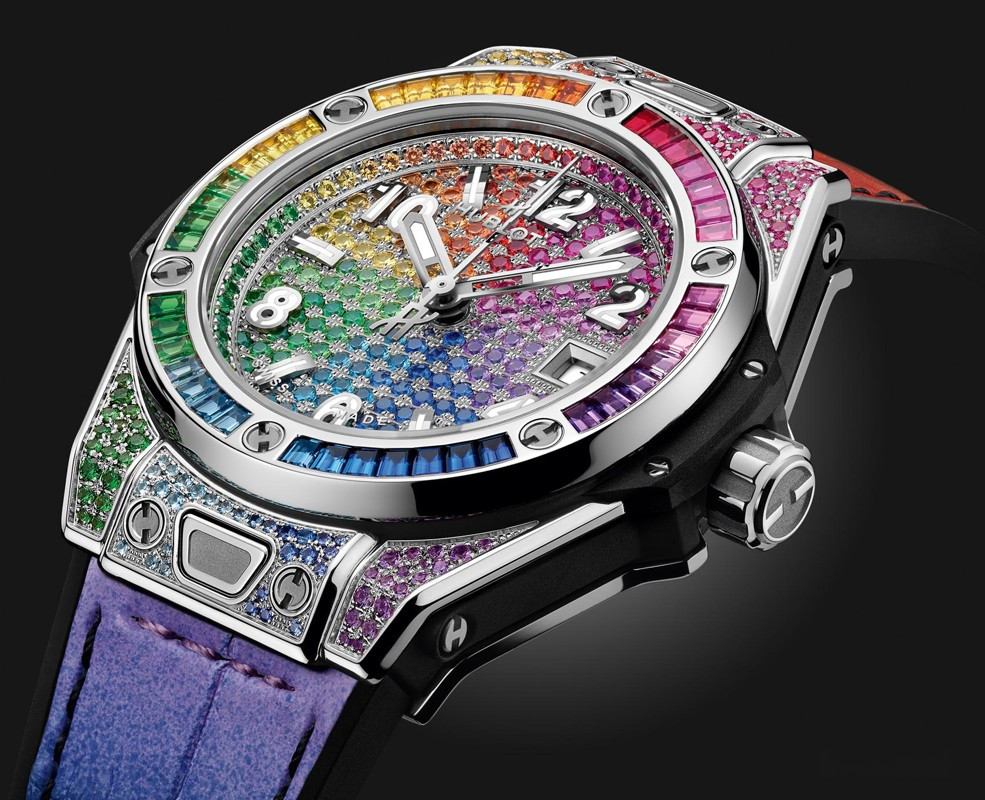 Часы Hublot Big Bang One Click 33 mm представлены в корпусе диаметром 33 мм из нержавеющей стали водонепроницаемостью 100 метров. Внутри корпуса установлен автоматический механизм, Калибр HUB1120, обладающий запасом хода 40 часов. На циферблате с 232 цветными драгоценными камнями отображаются часы, минуты, секунды, дата. Часы поставляются на каучуковом ремешке с застежкой из нержавеющей стали. Корпус инкрустирован 130 цветными драгоценными камнями: рубины, розовые сапфиры, аметисты, синие сапфиры, синие топазы, цавориты, желтые и оранжевые сапфиры.