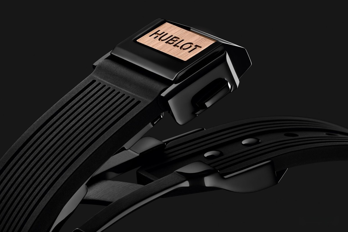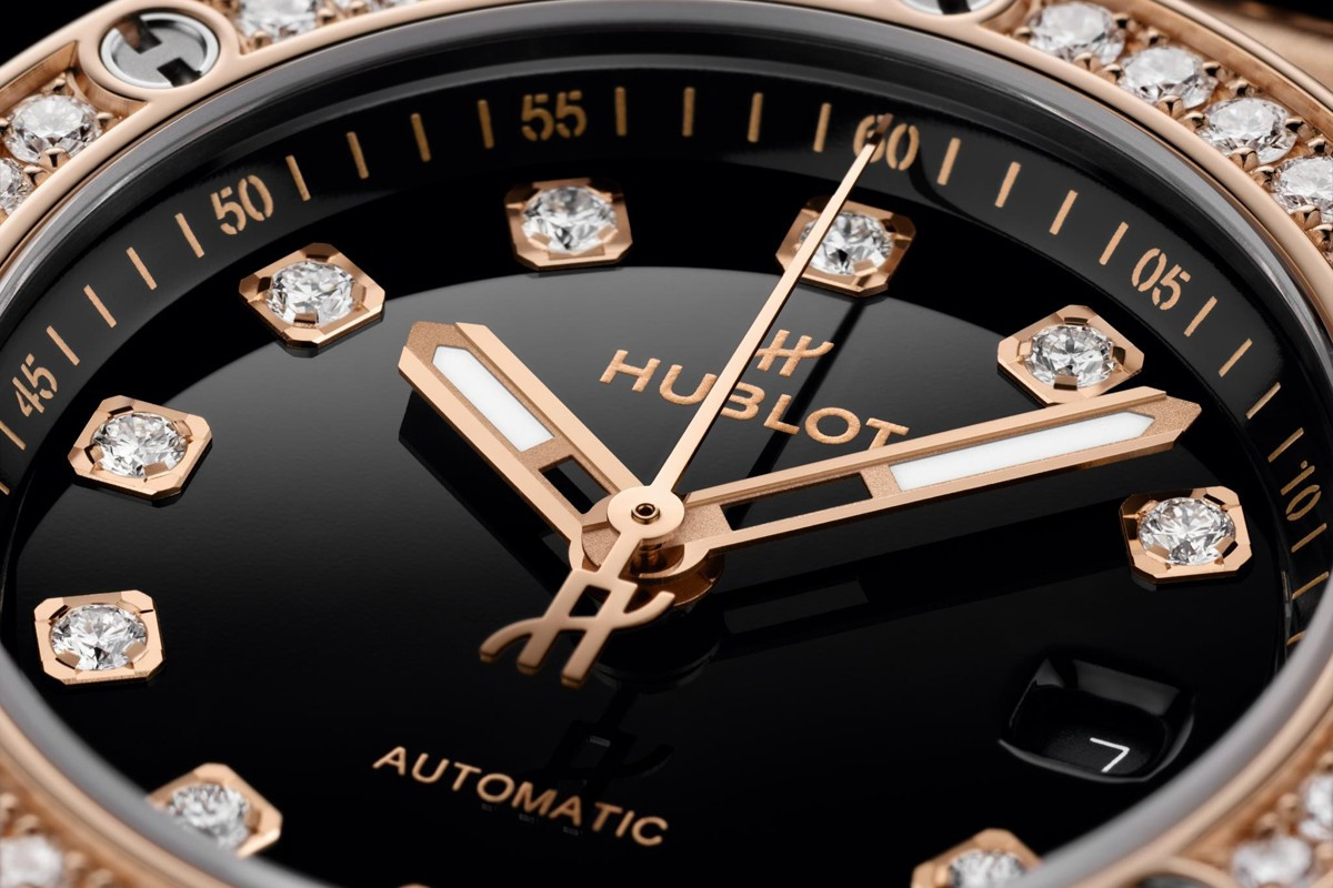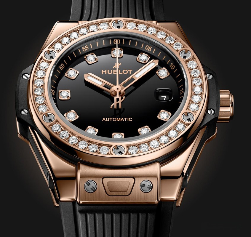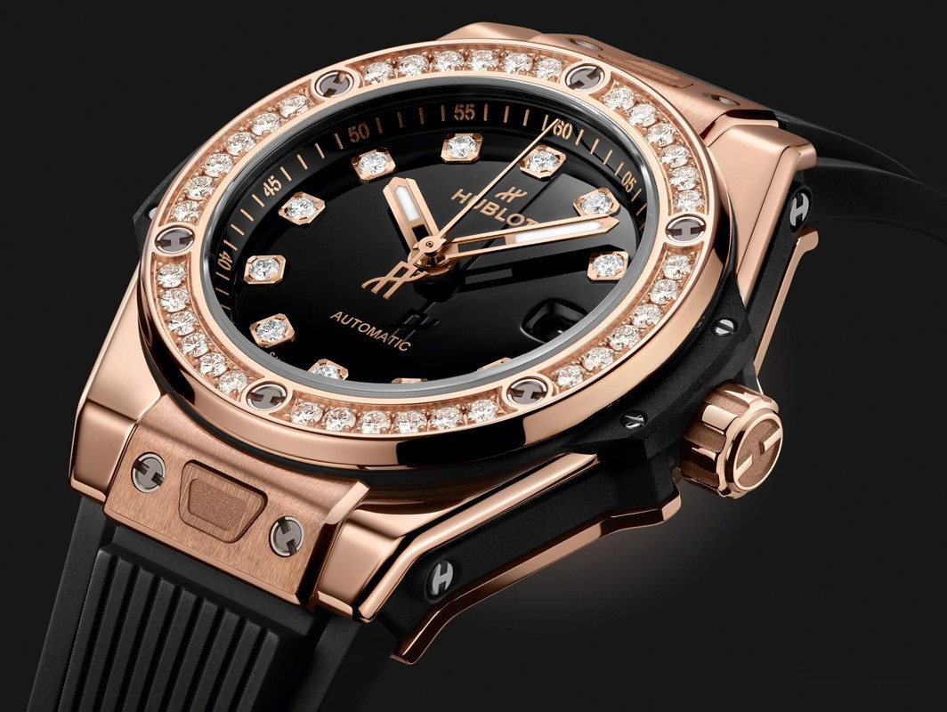 Часы Hublot Big Bang One Click 33 mm представлены в корпусе диаметром 33 мм из розового золота 18к водонепроницаемостью 100 метров. Внутри корпуса установлен автоматический механизм, Калибр HUB1120, обладающий запасом хода 40 часов. На черном циферблате с 11-ю белыми бриллиантами отображаются часы, минуты, секунды, дата. Часы поставляются на каучуковом ремешке с застежкой из розового золота 18к. Безель из белых бриллиантов.