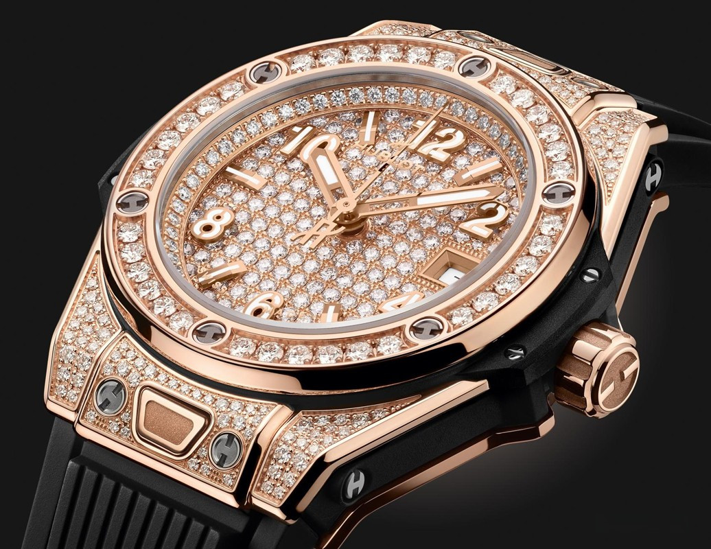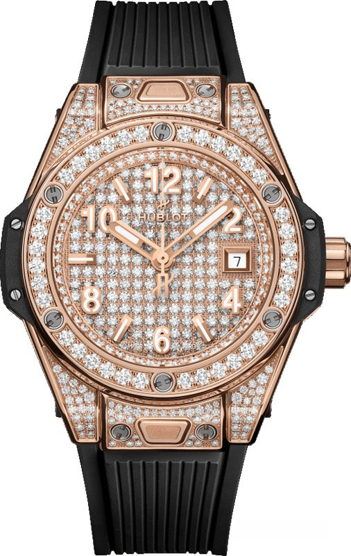 Часы Hublot Big Bang One Click 33 mm представлены в корпусе диаметром 33 мм из розового золота 18к водонепроницаемостью 100 метров. Внутри корпуса установлен автоматический механизм, Калибр HUB1120, обладающий запасом хода 40 часов. На циферблате с белыми бриллиантами отображаются часы, минуты, секунды, дата. Часы поставляются на каучуковом ремешке с застежкой из розового золота 18к. Корпус инкрустирован белыми бриллиантами.