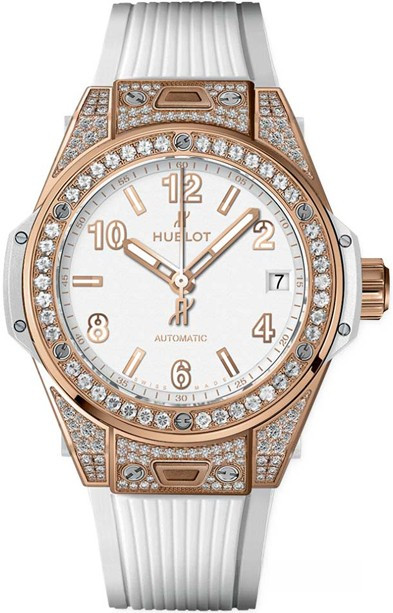 Часы представлены в корпусе из розового золота 18к размером 39 мм и водонепроницеамостью 100 метров. Внутри корпуса установлен автоматический механизм Калибр HUB 1710 с запасом хода 50 часов. На белом циферблате отображаются часы, минуты, секунды, дата. Часы комплектуются белым каучуковым ремешком с вставкой из розового золота 18к. Корпус инкрустирован белыми бриллиантами.