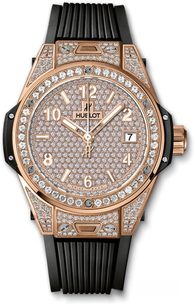 Часы представлены в корпусе из розового золота 18к размером 39 мм и водонепроницеамостью 100 метров. Внутри корпуса установлен автоматический механизм Калибр HUB 1710 с запасом хода 50 часов. На циферблате из белых бриллиантов отображаются часы, минуты, секунды, дата. Часы комплектуются черным каучуковым ремешком с вставкой из розового золота 18к.