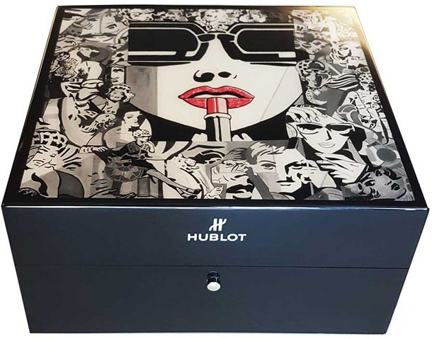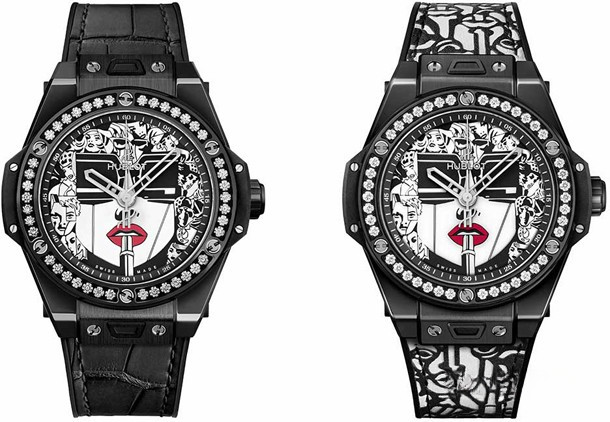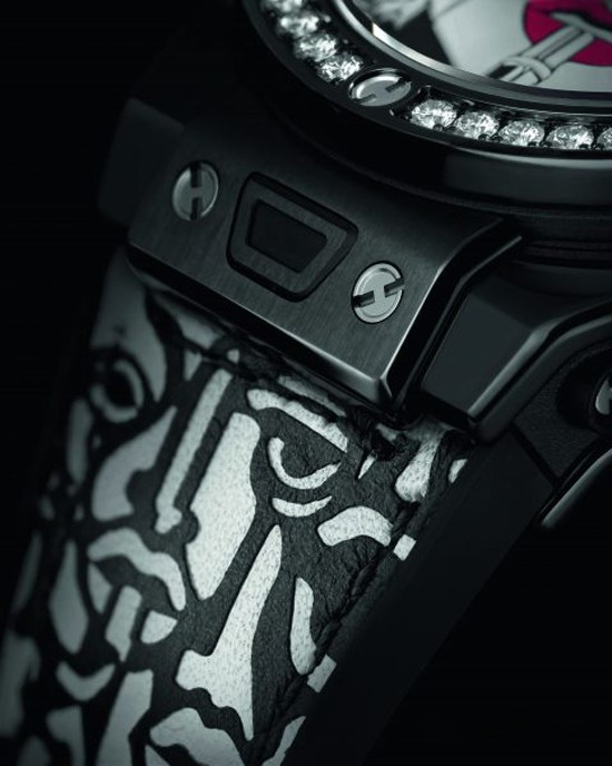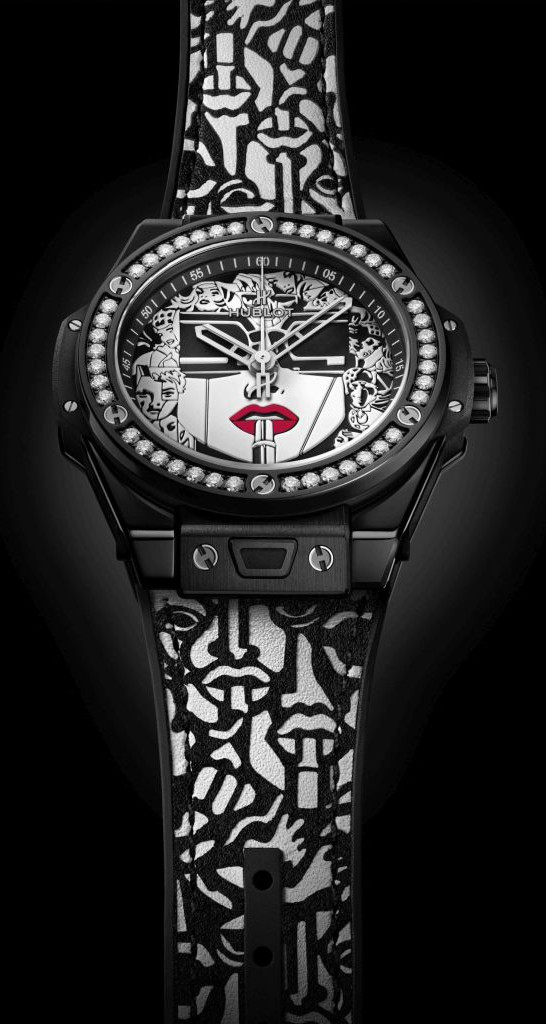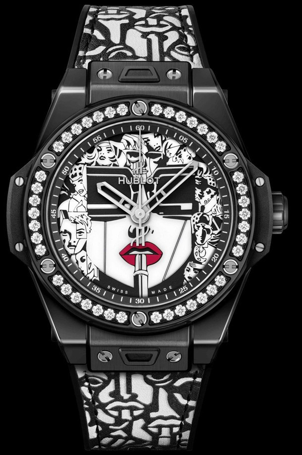 Часы Hublot Big Bang One Click Marc Ferrero 39 mm представлены в корпусе размером 39 х 12.55 мм из керамики водонепроницаемостью 100 метров. Внутри корпуса установлен автоматический механизм, Калибр HUB1710, обладающий запасом хода 50 часов. На белом с черным лакированном циферблате с мотивом от художника Марка Ферреро отображаются часы, минуты и секунды. Часы поставляются на ремешке из кожи аллигатора и каучука с вставкой из нержавеющей стали. Безель из 42-х белых бриллиантов общим весом 1 ct. Безель из 42-х белх бриллиантов.