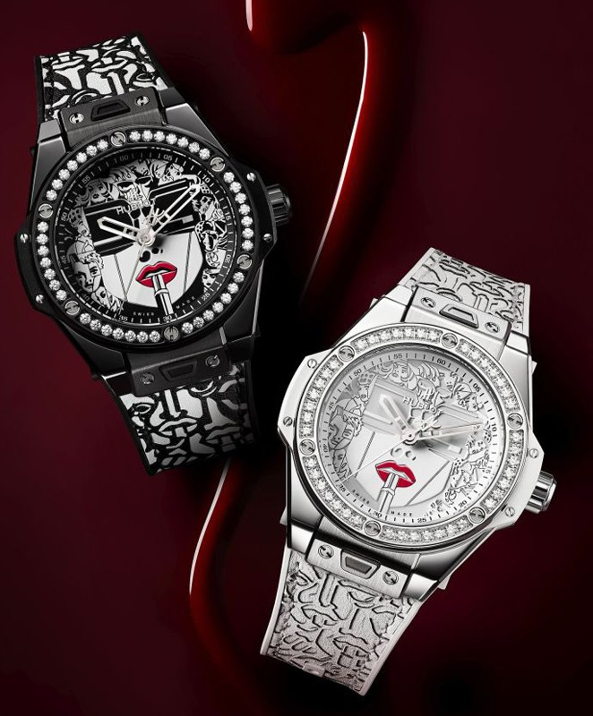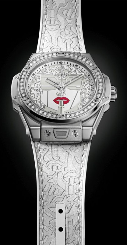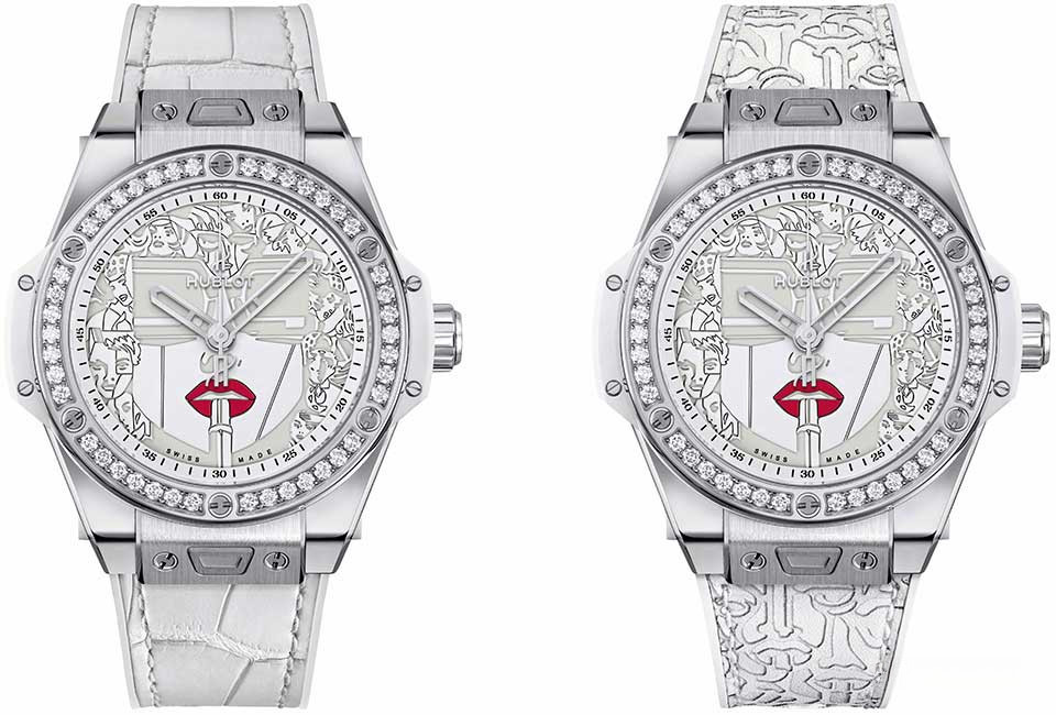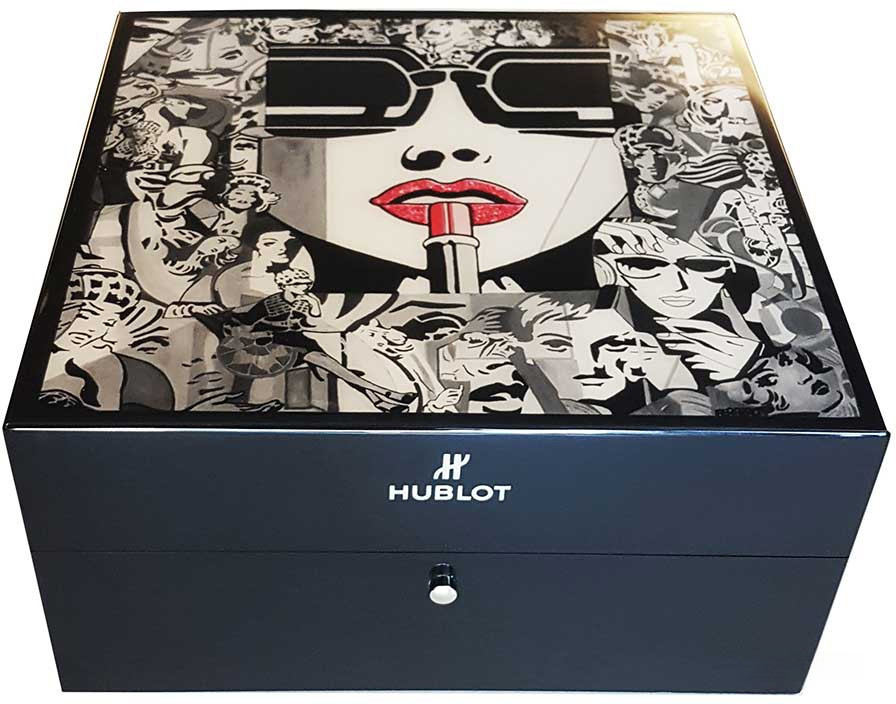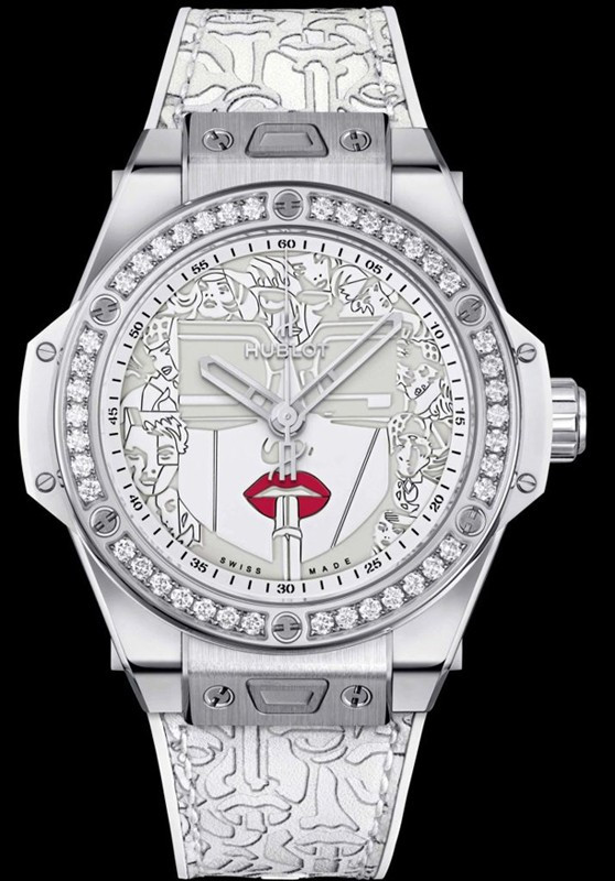 Часы Hublot Big Bang One Click Marc Ferrero 39 mm представлены в корпусе размером 39 х 12.55 мм из нержавеющей стали водонепроницаемостью 100 метров. Внутри корпуса установлен автоматический механизм, Калибр HUB1710, обладающий запасом хода 50 часов. На белом лакированном циферблате с мотивом от художника Марка Ферреро отображаются часы, минуты и секунды. Часы поставляются на ремешке из кожи аллигатора и каучука с вставкой из нержавеющей стали. Безель из 42-х белых бриллиантов общим весом 1 ct. Безель из 42-х белх бриллиантов.