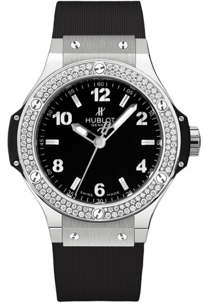 Часы Hublot Big Bang 38mm Steel Diamonds 361.SX.1270.RX.1104 обладают круглым корпусом из нержавеющей стали, диаметром 38 мм, водонепроницаемостью до 100 м. Безель из 126-и белых бриллиантов, общим весом 0.87ct. На торце рифленой заводной головки, расположенной на 3 часах, имеется логотип в виде большой буквы Н. Сапфировое стекло установлено на передней стороне часового корпуса (с антибликовым покрытием) и на его завинчивающейся задней крышке. Циферблат черного цвета со скелетированными стрелками. Модель оснащена кварцевым мануфактурным швейцарским механизмом, с функциями индикации часов, минут и секунд. Калибр отменно отделан и декорирован. Поставляется на ремешке из каучука с вставкой из нержавеющей стали.