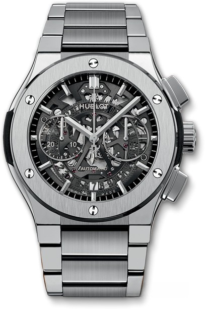 Часы Hublot Classic Fusion Aerofusion Chronograph Titanium преставлены в корпусе размером 45 х 13.4 мм из титана водонепроницаемостю до 50 метров. Внутри часов установлен автоматический механизм, Калибр HUB1155, с запасом хода 42 часа. На сером скелетированном циферблате отображаются часы, минуты, секунды, дата, накопители хронографа. Часы комплектуются титановым браслетом.