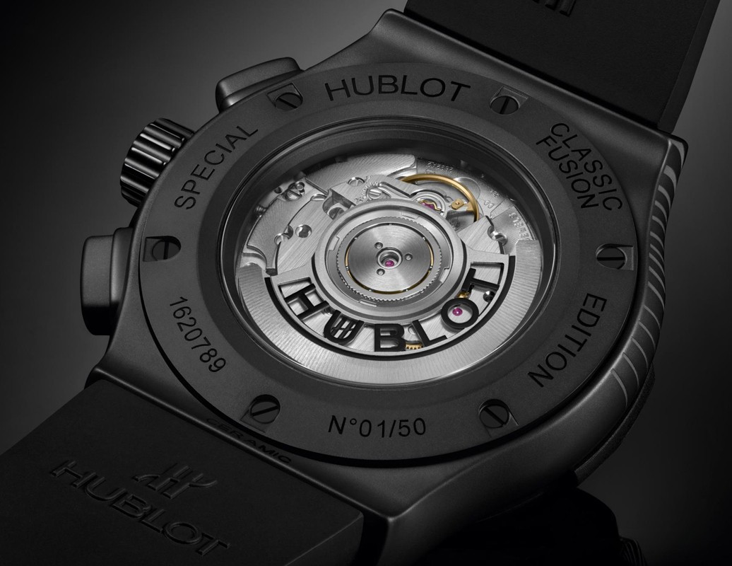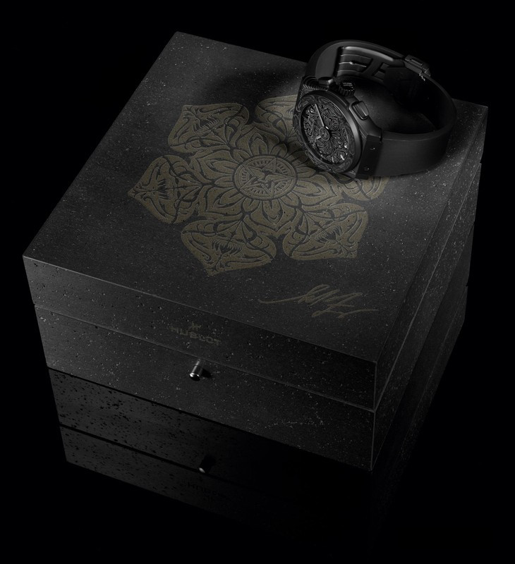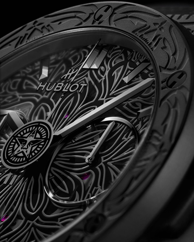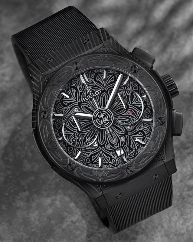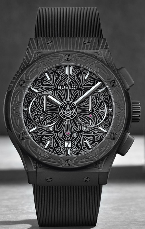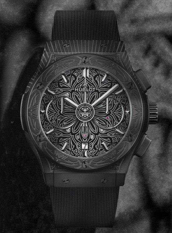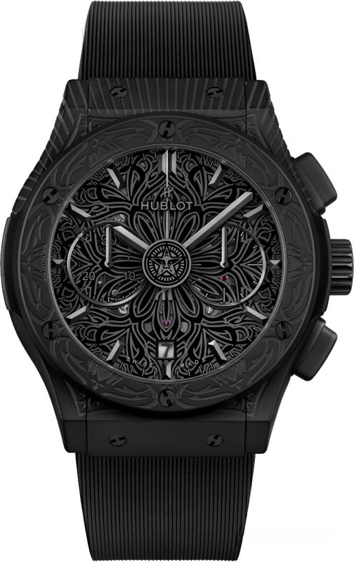 Часы Hublot Classic Fusion Aerofusion Chronograph All Black Shepard Fairey 45 mm представлены в корпусе размером 45 мм из керамики водонепроницаемостью 50 метров. Внутри корпуса установлен автоматический механизм, Калибр HUB1155, обладающий запасом хода 42 часа. На черном циферблате отображаются часы, минуты, секунды, дата, хронограф. Часы поставляются на каучуковом ремешке с застежкой из нержавеющей стали. Серия ограничена - 50 шт.
